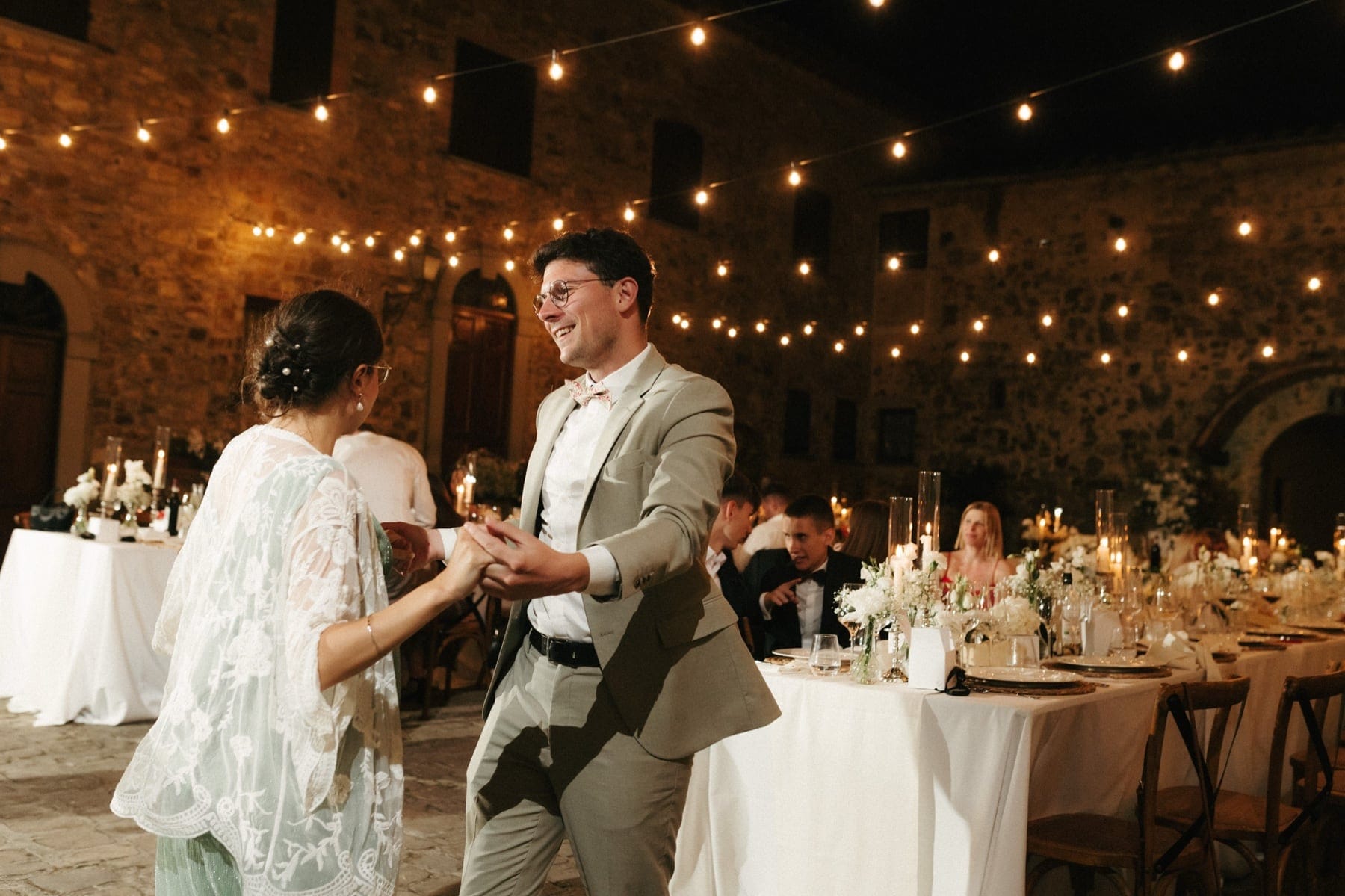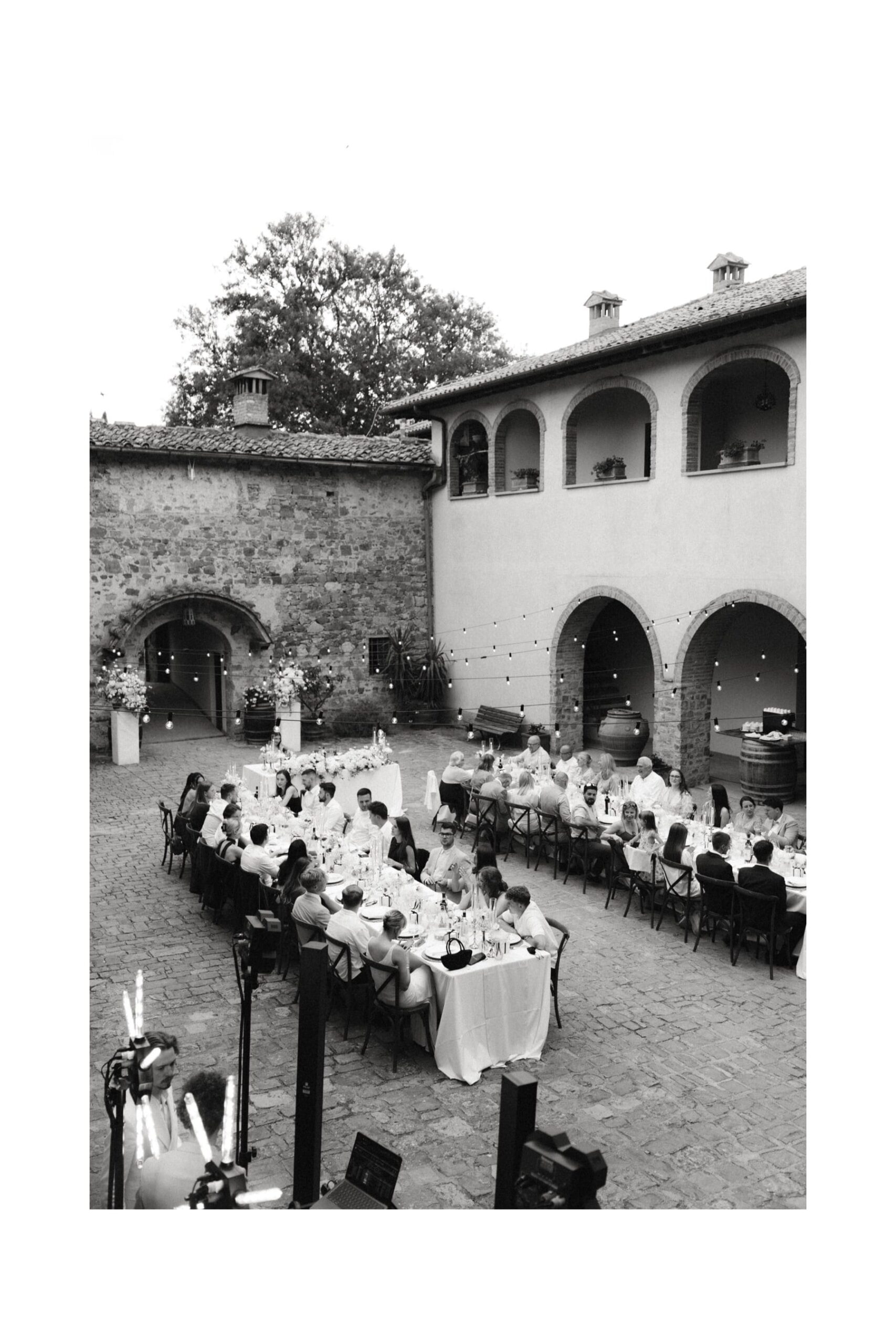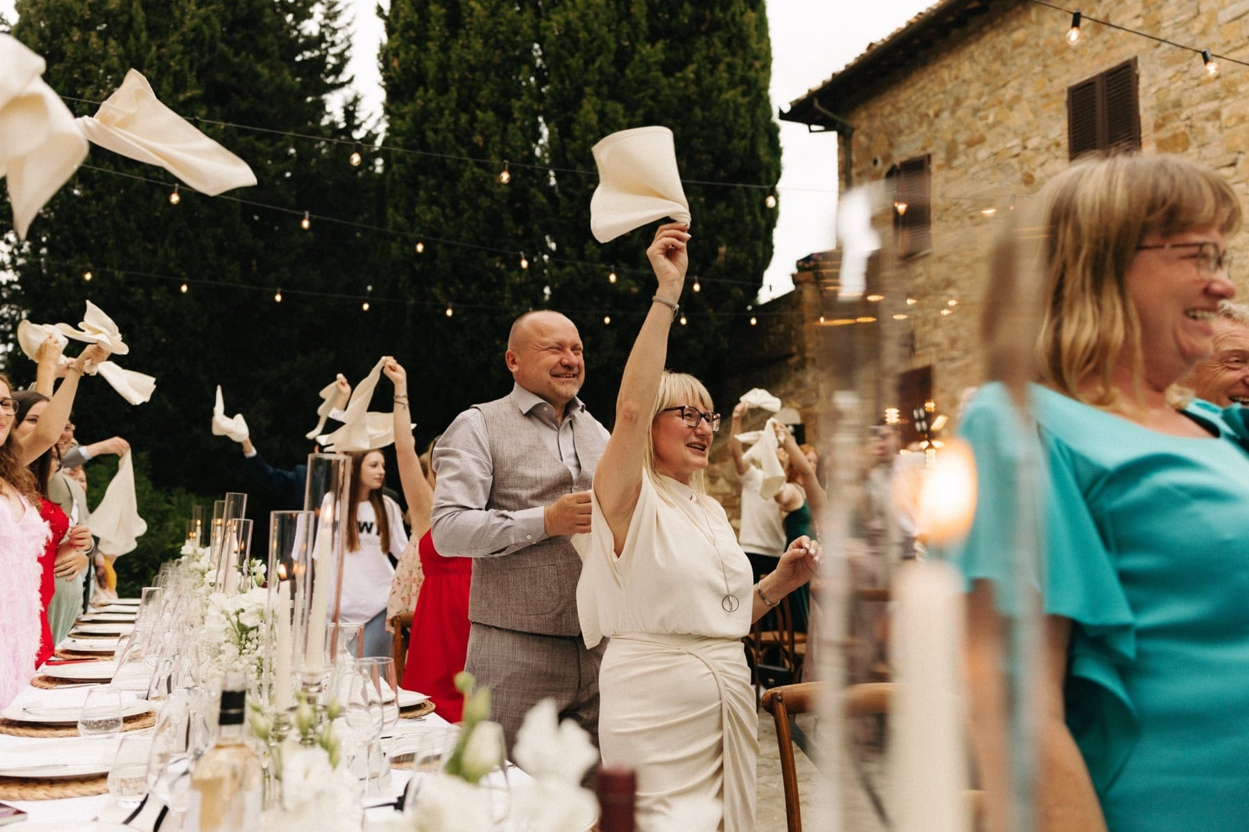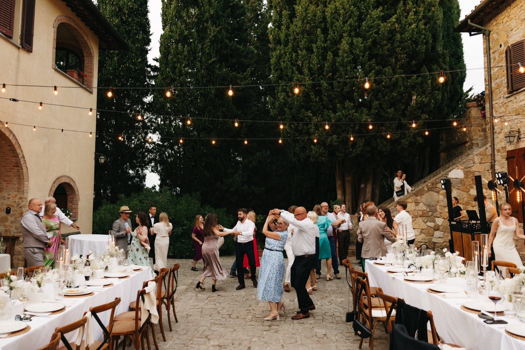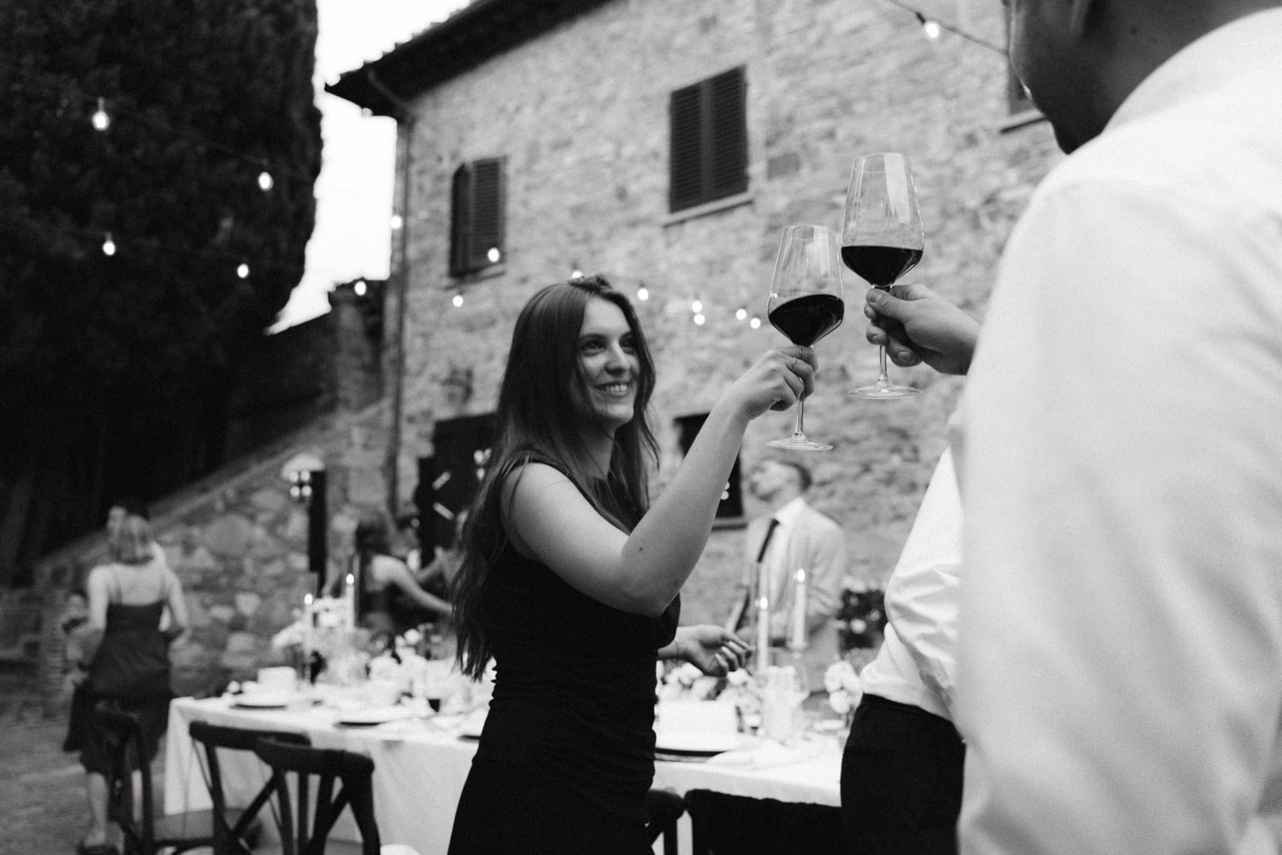 Po ceremonii wszyscy wrócili do Quercia al Poggio, gdzie na dziedzińcu czekały długie stoły, starannie dopracowane detale, światło girland i ciepły wieczór stworzyły klimat, który trudno opisać słowami. Wesele w Toskanii ma swój unikalny rytm – zaczyna się kolacją, rozmowami, winem i celebracją chwili, a dopiero później płynnie przechodzi w zabawę. Nie ma pośpiechu, nie ma napięcia – jest za to pełna obecność i radość. Goście bawili się do późnej nocy, a całe wydarzenie było dokładnie takie, jak powinno wyglądać wesele w Toskanii – naturalne, swobodne i pełne życia.