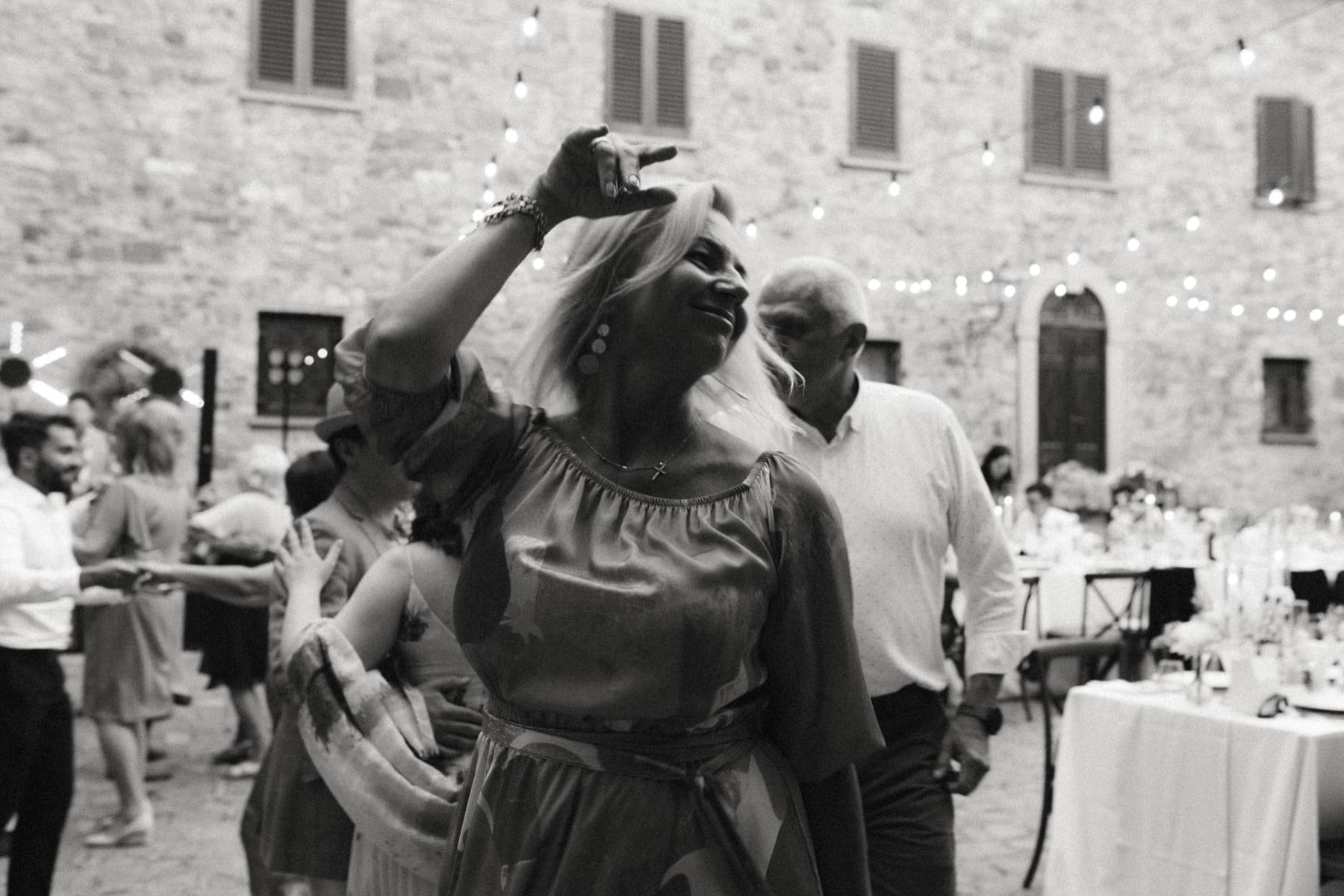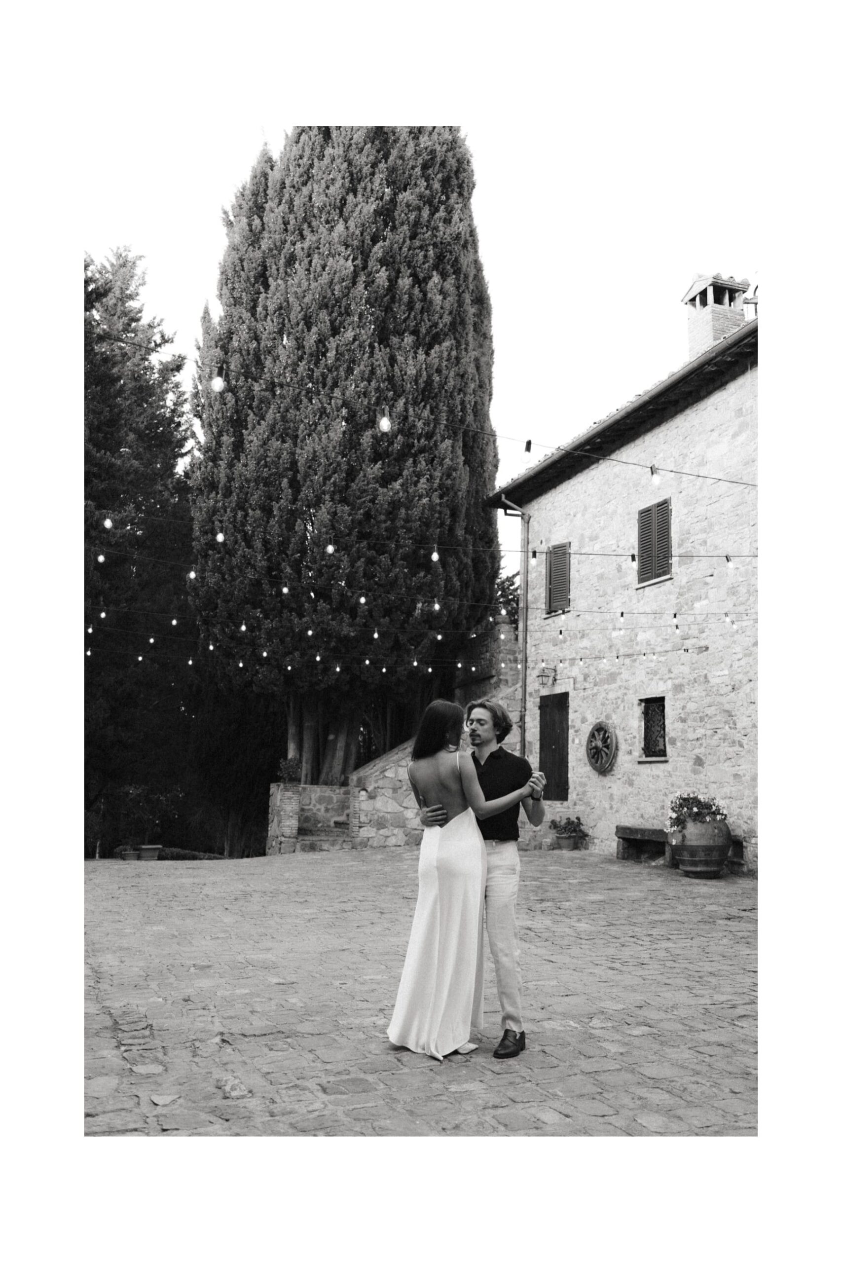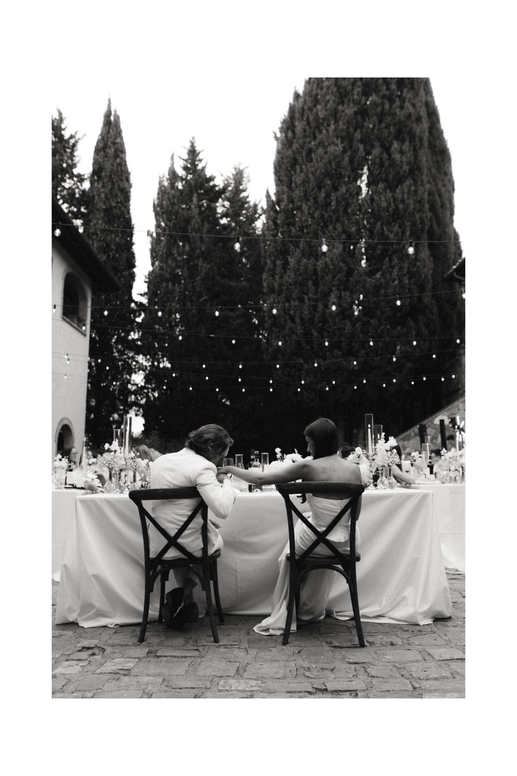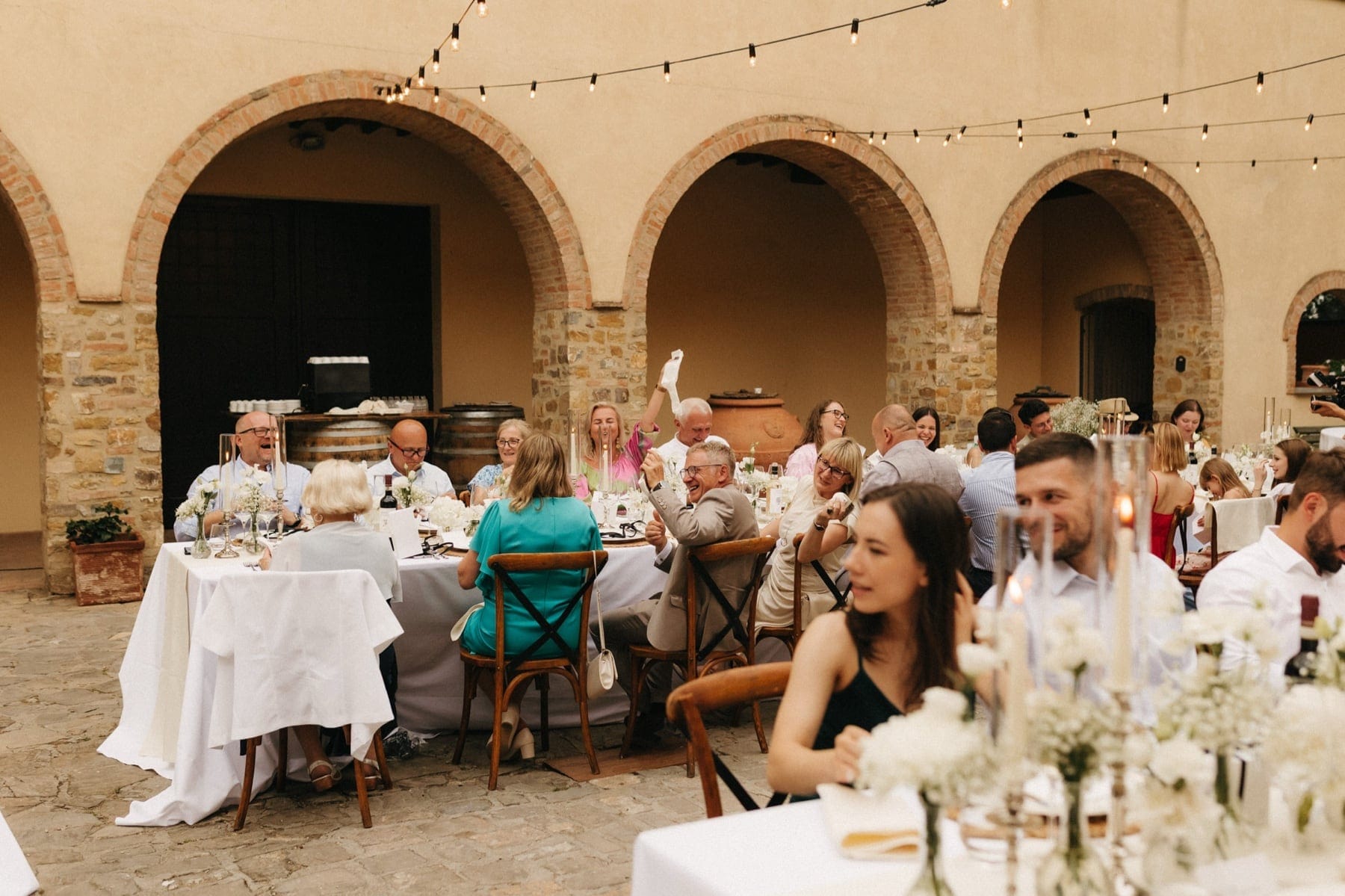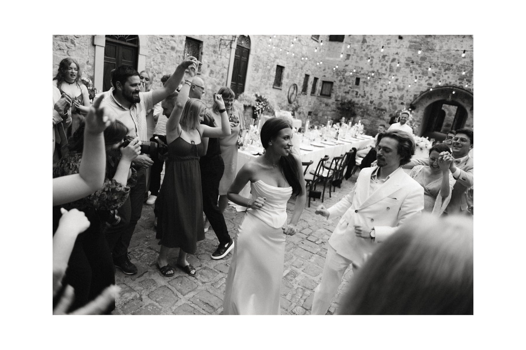 Po ceremonii wszyscy wrócili do Quercia al Poggio, gdzie na dziedzińcu czekały długie stoły, starannie dopracowane detale, światło girland i ciepły wieczór stworzyły klimat, który trudno opisać słowami. Wesele w Toskanii ma swój unikalny rytm – zaczyna się kolacją, rozmowami, winem i celebracją chwili, a dopiero później płynnie przechodzi w zabawę. Nie ma pośpiechu, nie ma napięcia – jest za to pełna obecność i radość. Goście bawili się do późnej nocy, a całe wydarzenie było dokładnie takie, jak powinno wyglądać wesele w Toskanii – naturalne, swobodne i pełne życia.