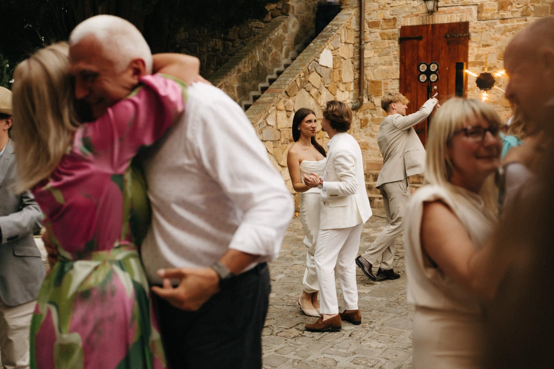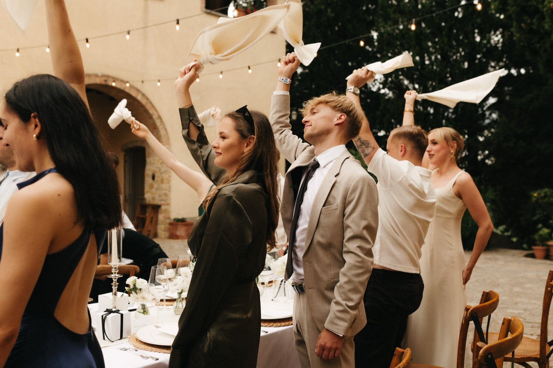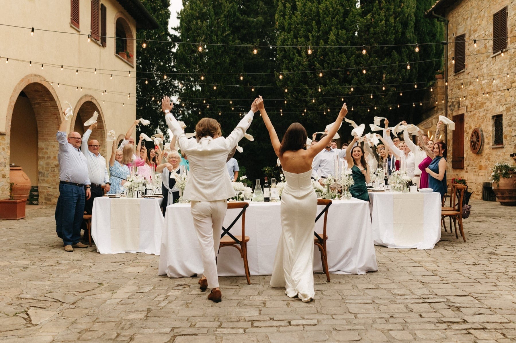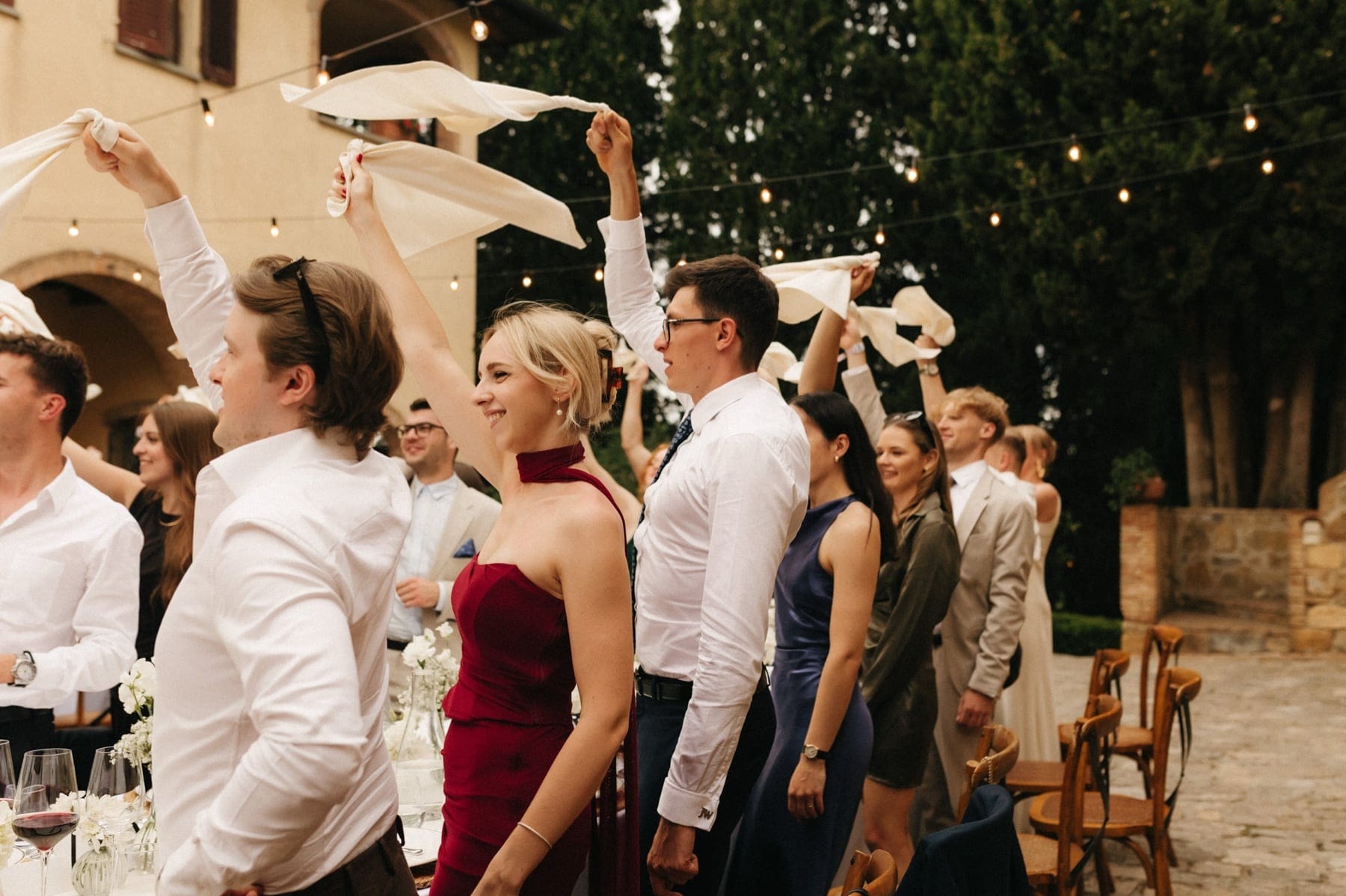 Po ceremonii wszyscy wrócili do Quercia al Poggio, gdzie na dziedzińcu czekały długie stoły, starannie dopracowane detale, światło girland i ciepły wieczór stworzyły klimat, który trudno opisać słowami. Wesele w Toskanii ma swój unikalny rytm – zaczyna się kolacją, rozmowami, winem i celebracją chwili, a dopiero później płynnie przechodzi w zabawę. Nie ma pośpiechu, nie ma napięcia – jest za to pełna obecność i radość. Goście bawili się do późnej nocy, a całe wydarzenie było dokładnie takie, jak powinno wyglądać wesele w Toskanii – naturalne, swobodne i pełne życia.