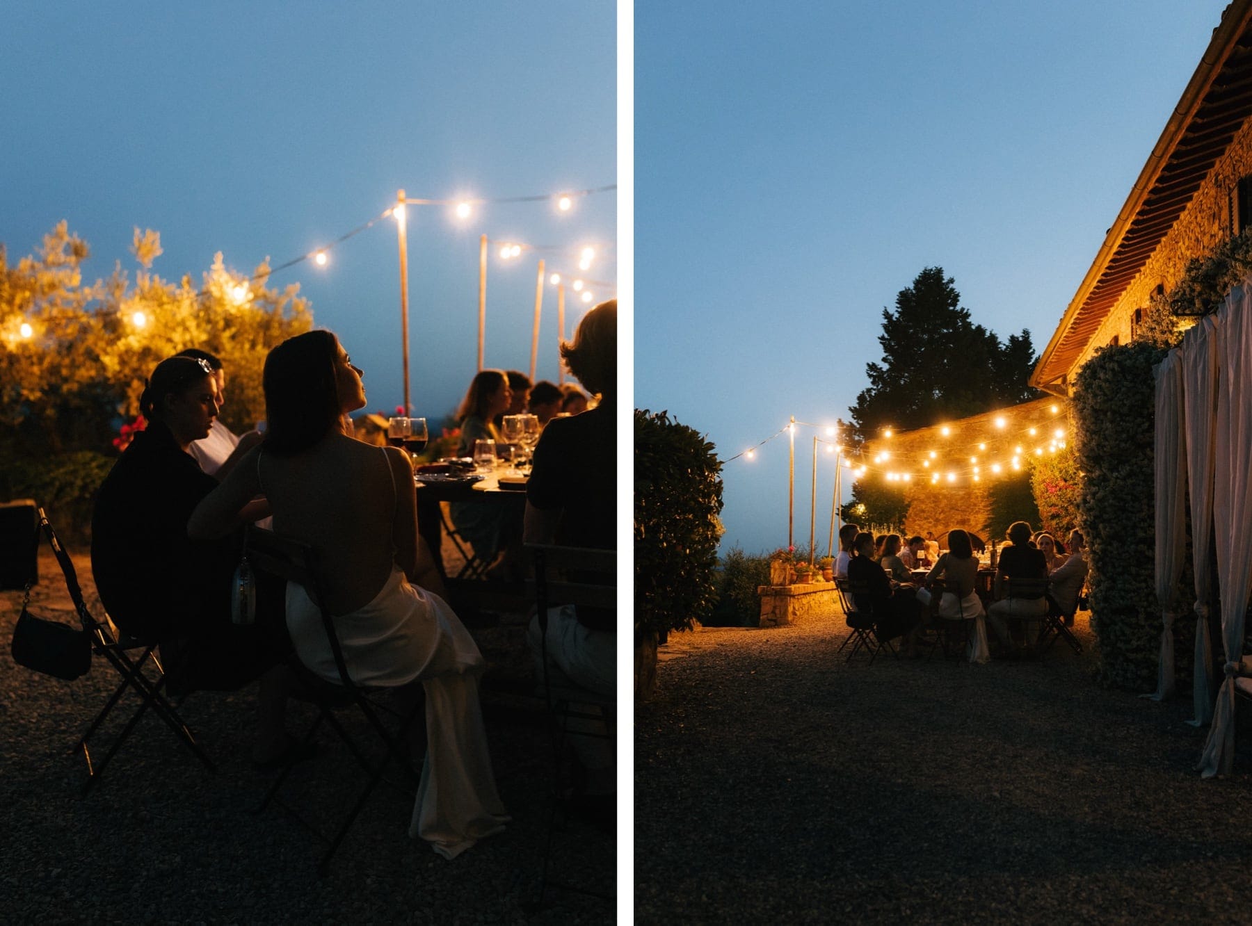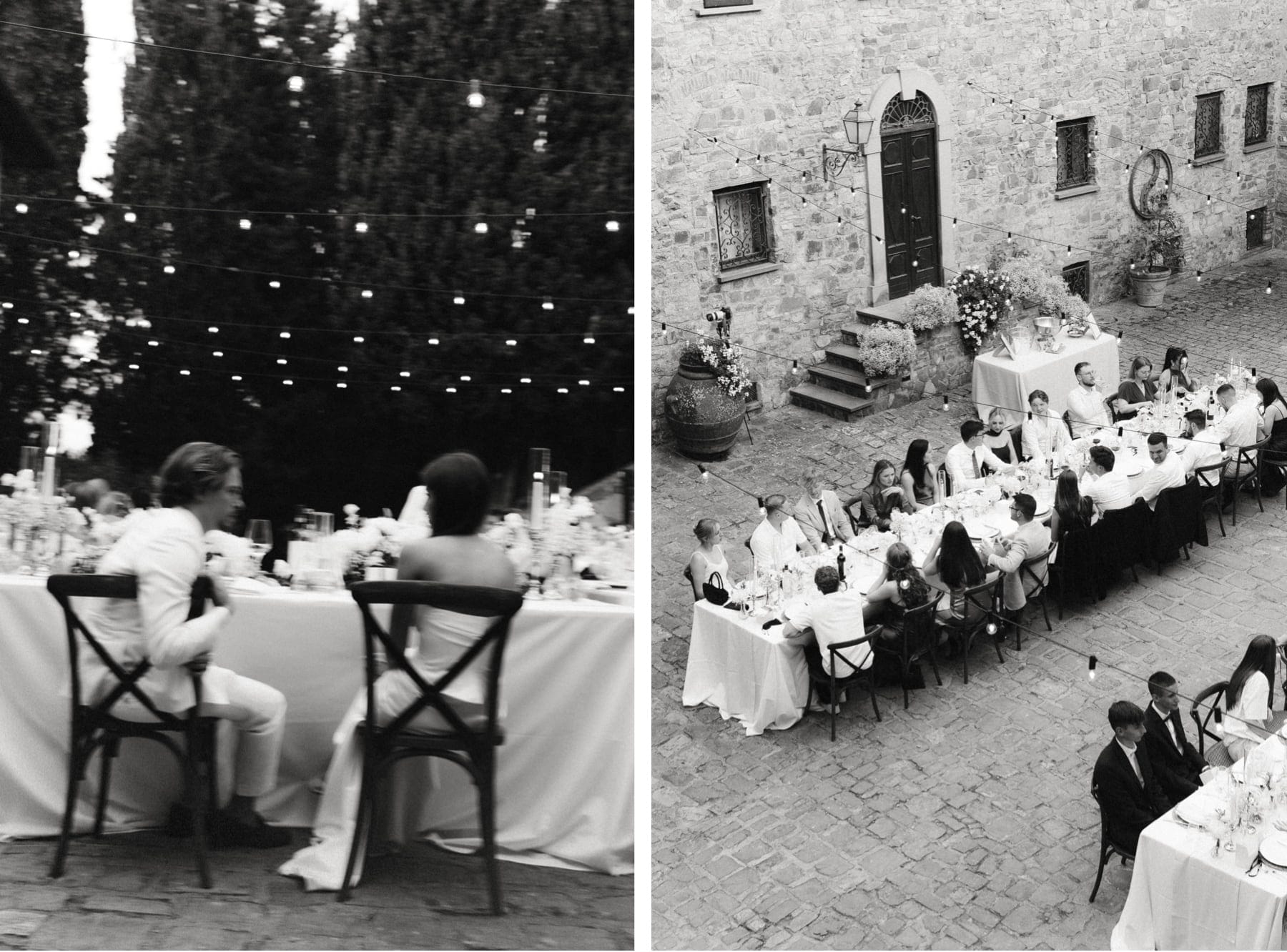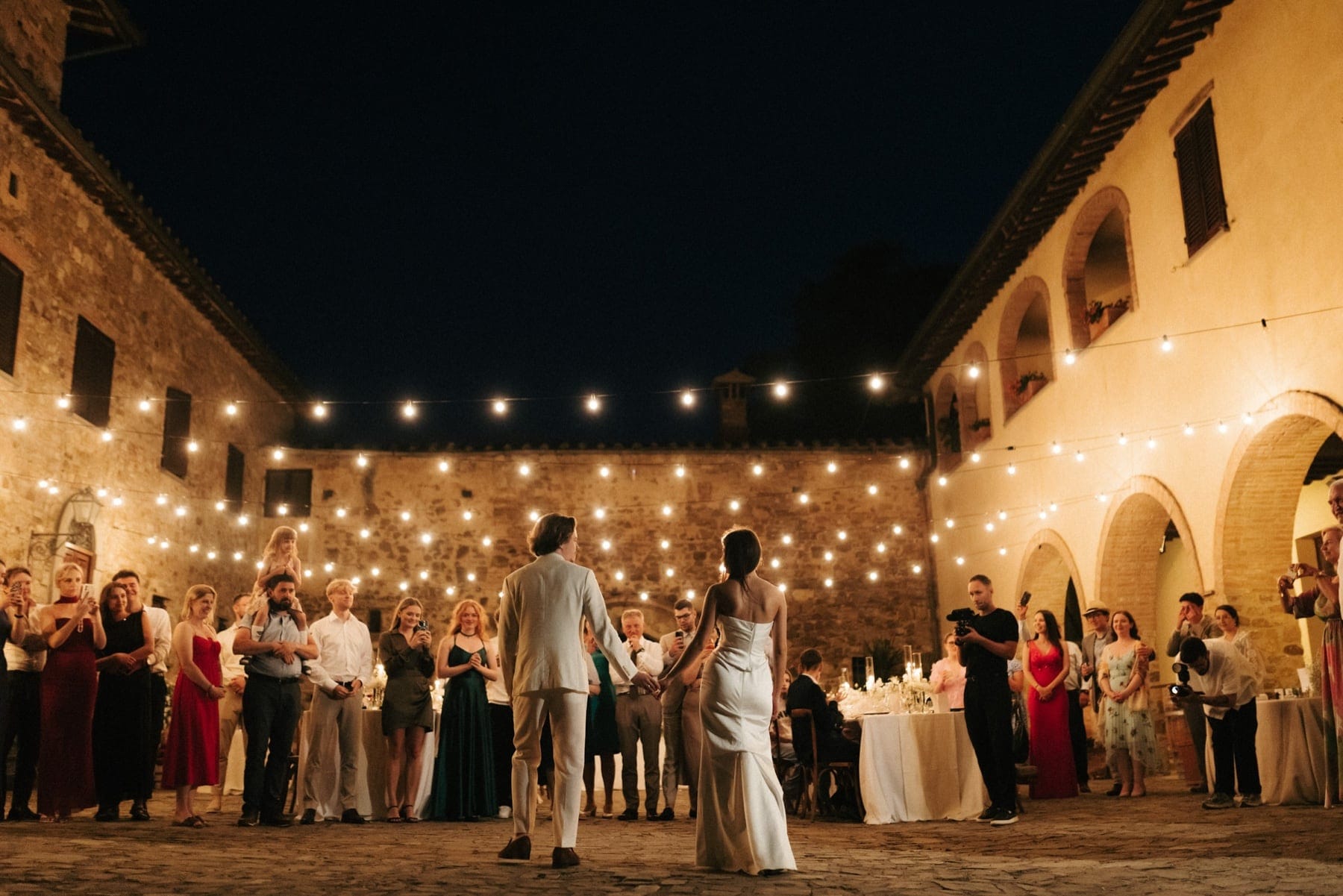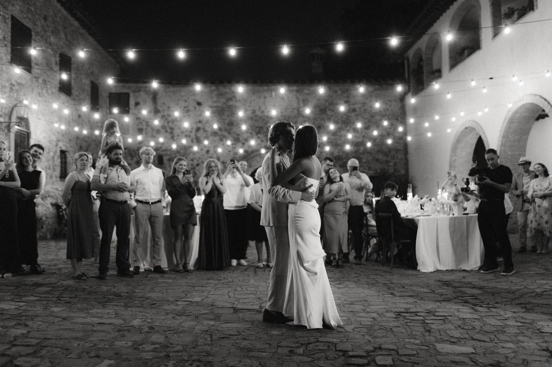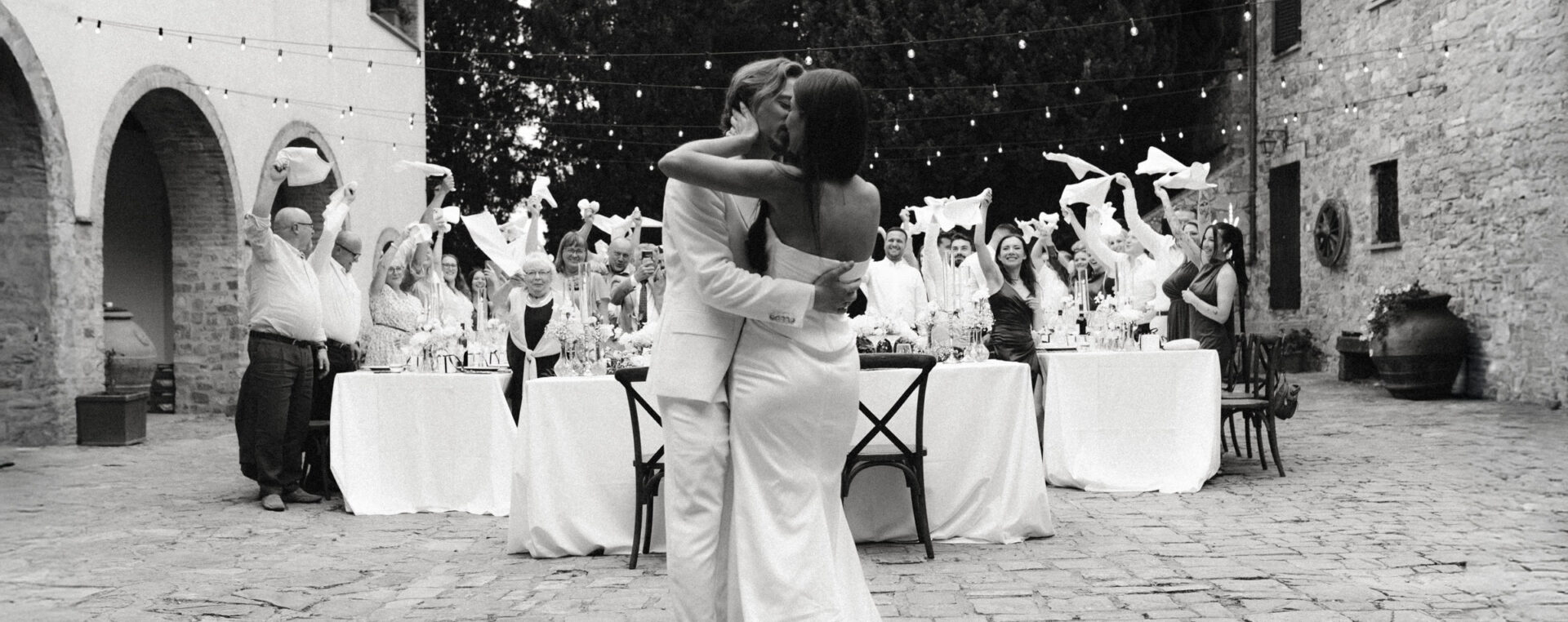 Po ceremonii wszyscy wrócili do Quercia al Poggio, gdzie na dziedzińcu czekały długie stoły, starannie dopracowane detale, światło girland i ciepły wieczór stworzyły klimat, który trudno opisać słowami. Wesele w Toskanii ma swój unikalny rytm – zaczyna się kolacją, rozmowami, winem i celebracją chwili, a dopiero później płynnie przechodzi w zabawę. Nie ma pośpiechu, nie ma napięcia – jest za to pełna obecność i radość. Goście bawili się do późnej nocy, a całe wydarzenie było dokładnie takie, jak powinno wyglądać wesele w Toskanii – naturalne, swobodne i pełne życia.