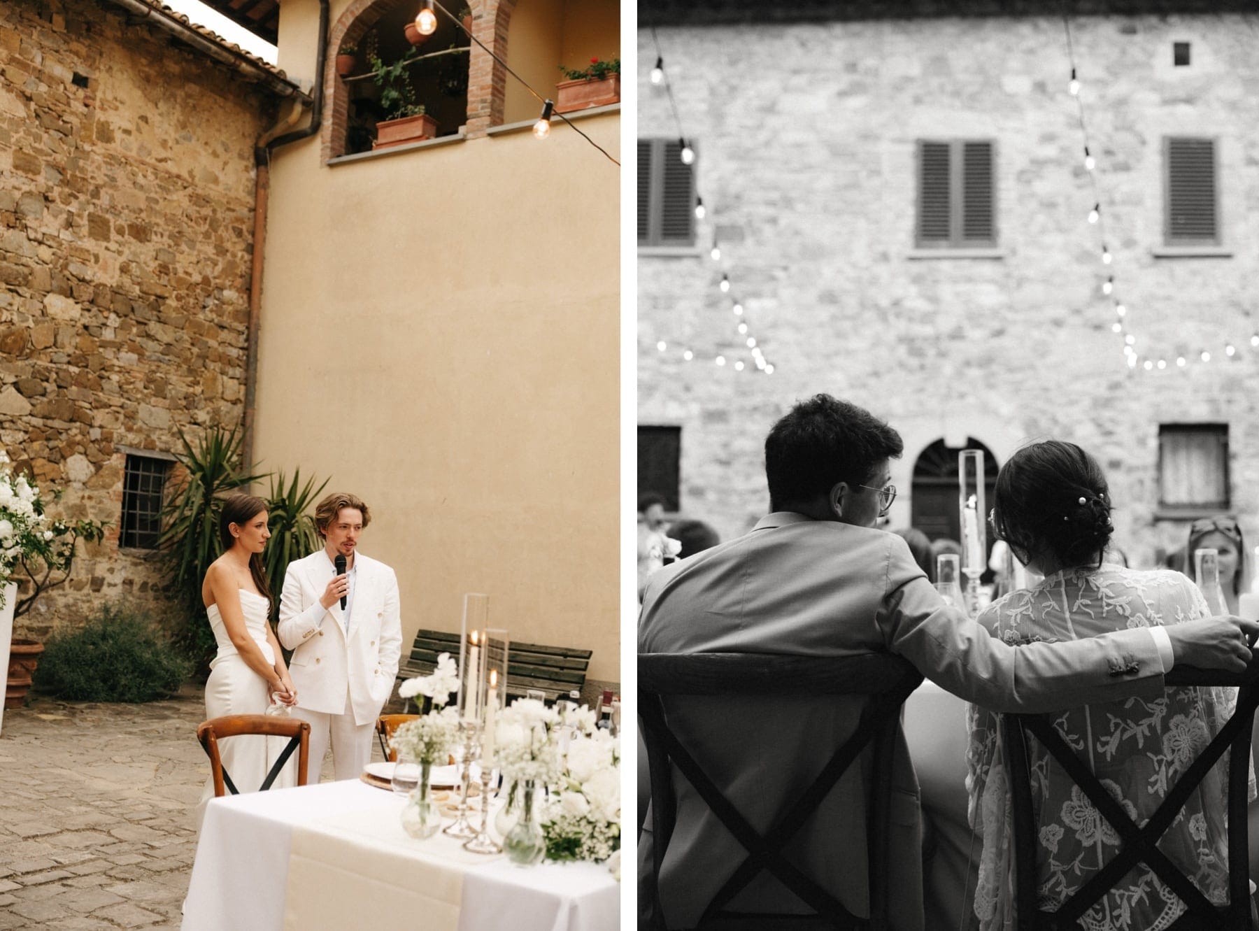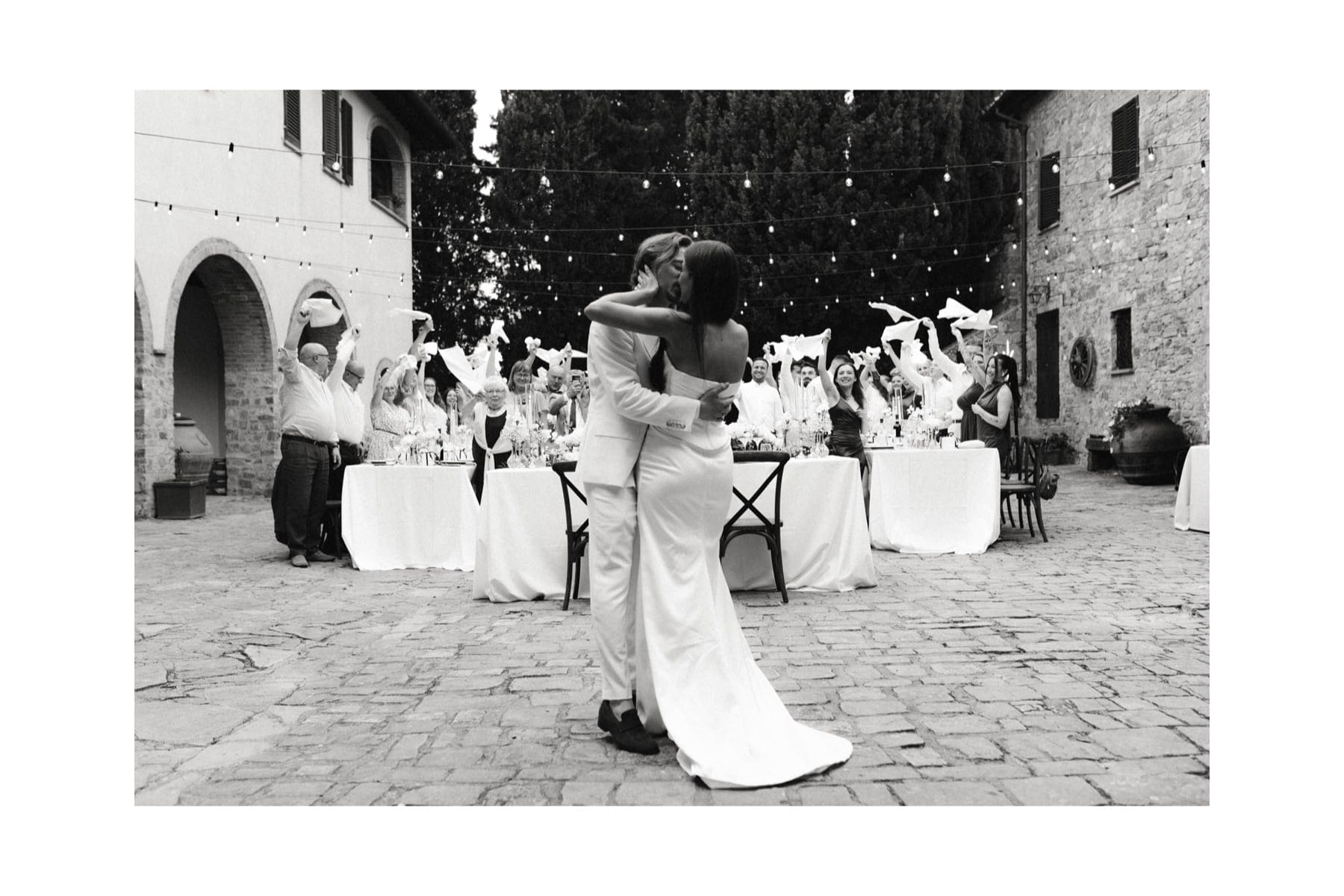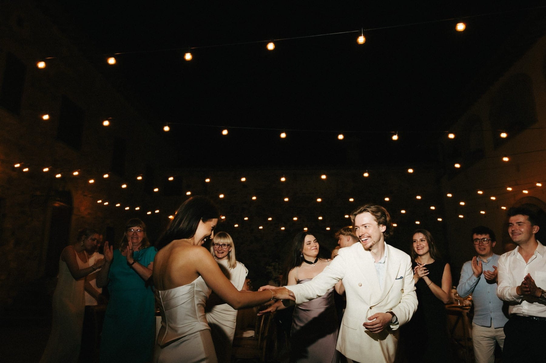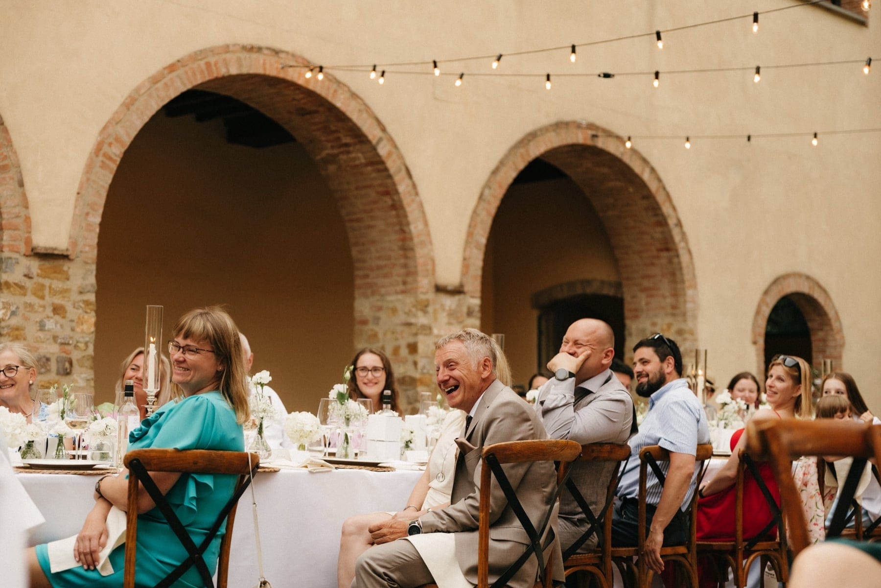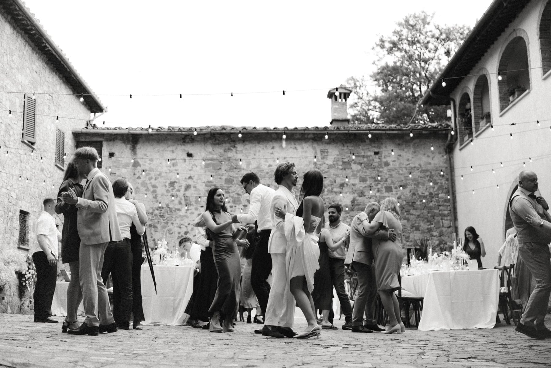 Po ceremonii wszyscy wrócili do Quercia al Poggio, gdzie na dziedzińcu czekały długie stoły, starannie dopracowane detale, światło girland i ciepły wieczór stworzyły klimat, który trudno opisać słowami. Wesele w Toskanii ma swój unikalny rytm – zaczyna się kolacją, rozmowami, winem i celebracją chwili, a dopiero później płynnie przechodzi w zabawę. Nie ma pośpiechu, nie ma napięcia – jest za to pełna obecność i radość. Goście bawili się do późnej nocy, a całe wydarzenie było dokładnie takie, jak powinno wyglądać wesele w Toskanii – naturalne, swobodne i pełne życia.