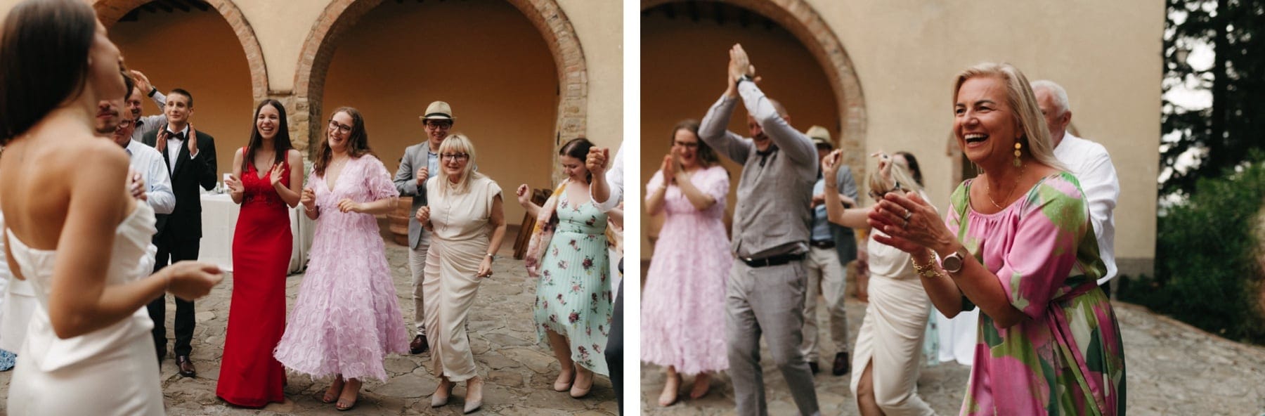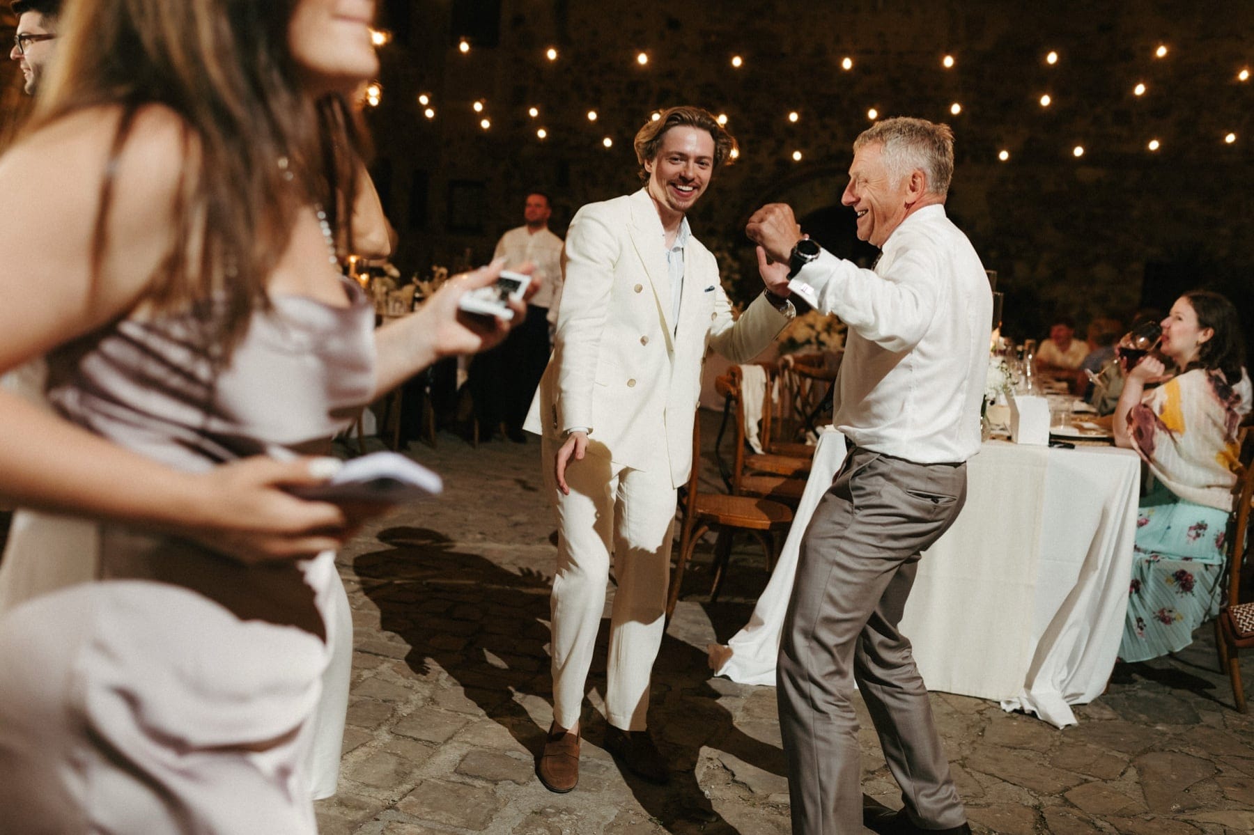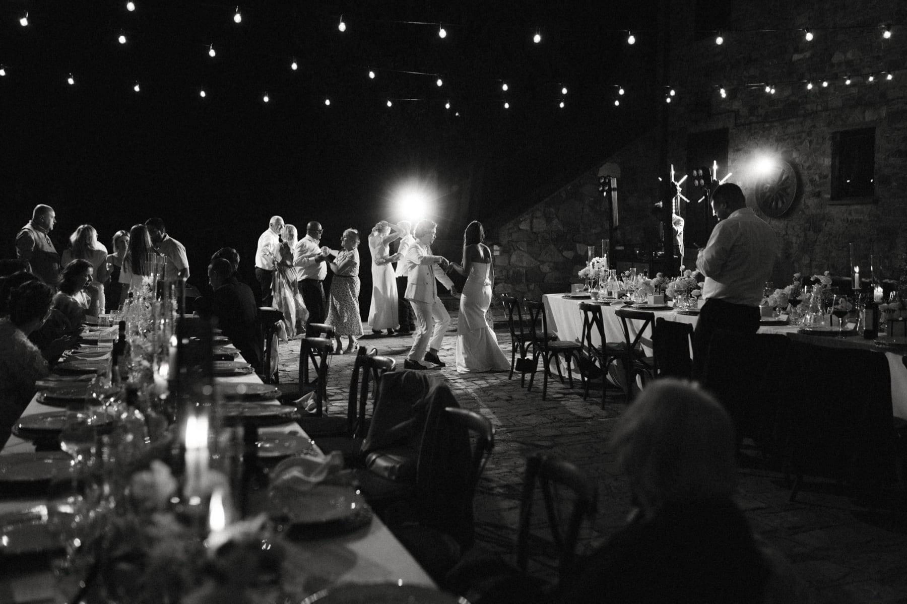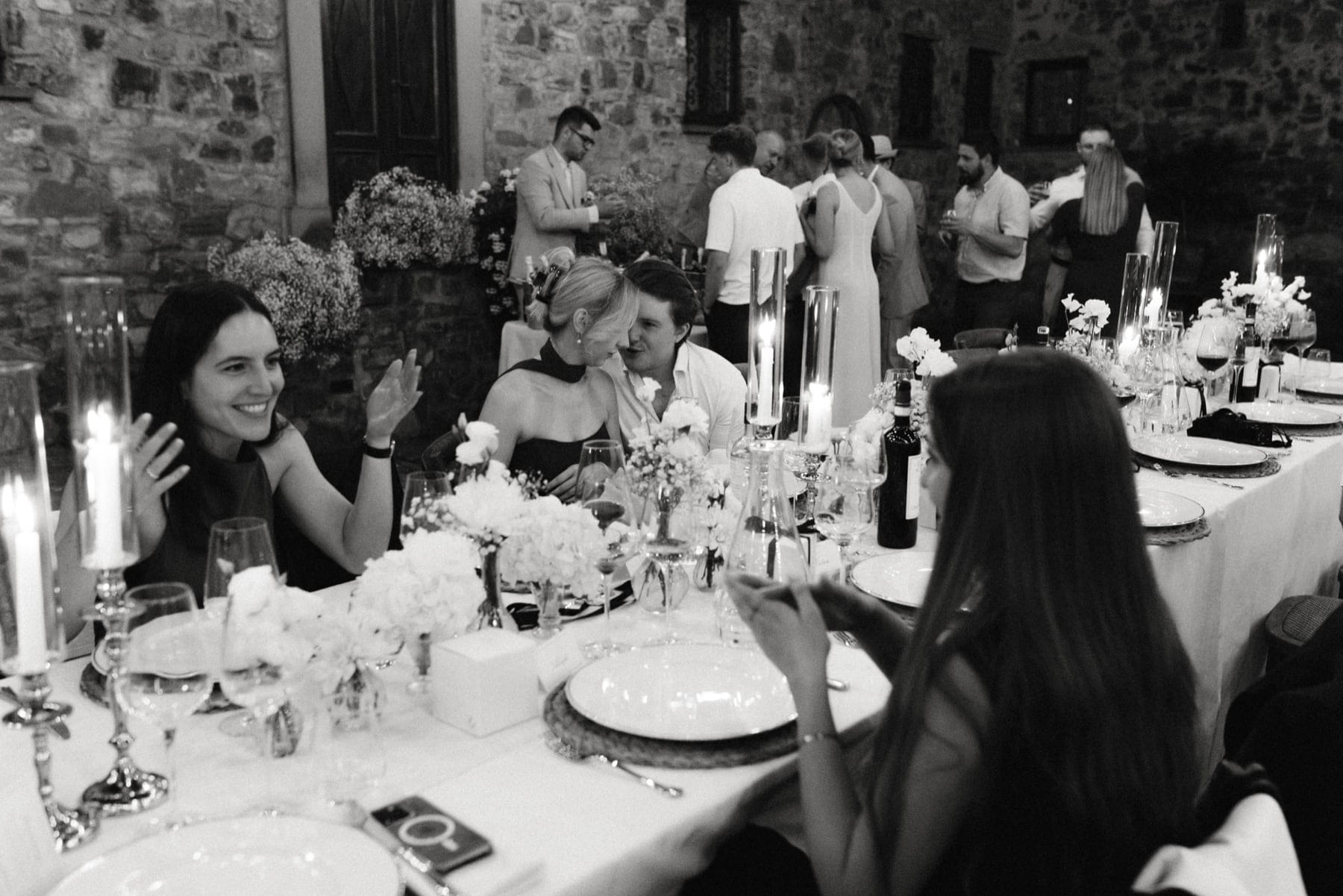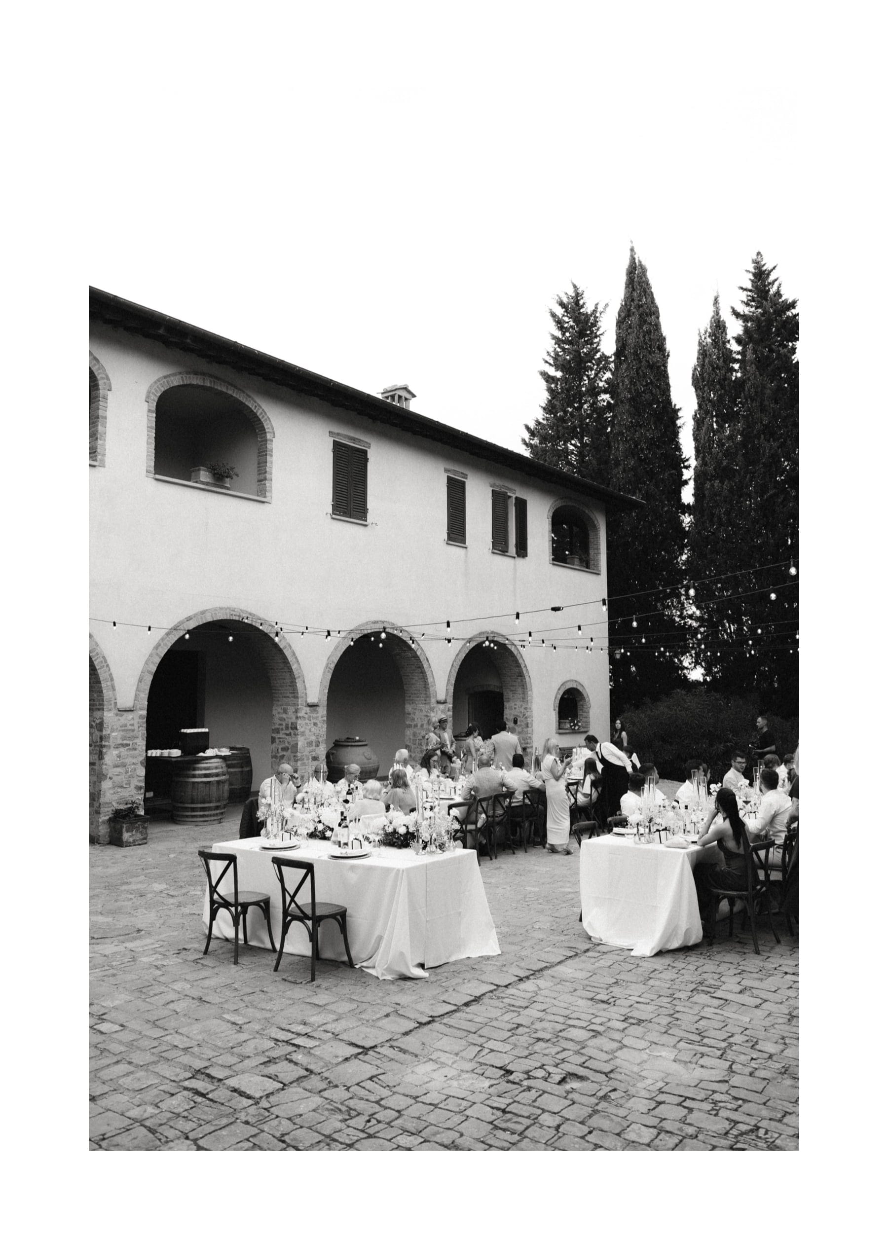 Po ceremonii wszyscy wrócili do Quercia al Poggio, gdzie na dziedzińcu czekały długie stoły, starannie dopracowane detale, światło girland i ciepły wieczór stworzyły klimat, który trudno opisać słowami. Wesele w Toskanii ma swój unikalny rytm – zaczyna się kolacją, rozmowami, winem i celebracją chwili, a dopiero później płynnie przechodzi w zabawę. Nie ma pośpiechu, nie ma napięcia – jest za to pełna obecność i radość. Goście bawili się do późnej nocy, a całe wydarzenie było dokładnie takie, jak powinno wyglądać wesele w Toskanii – naturalne, swobodne i pełne życia.