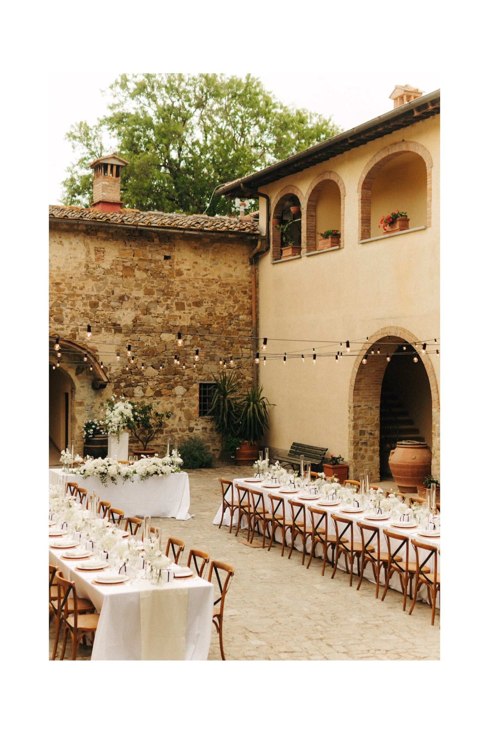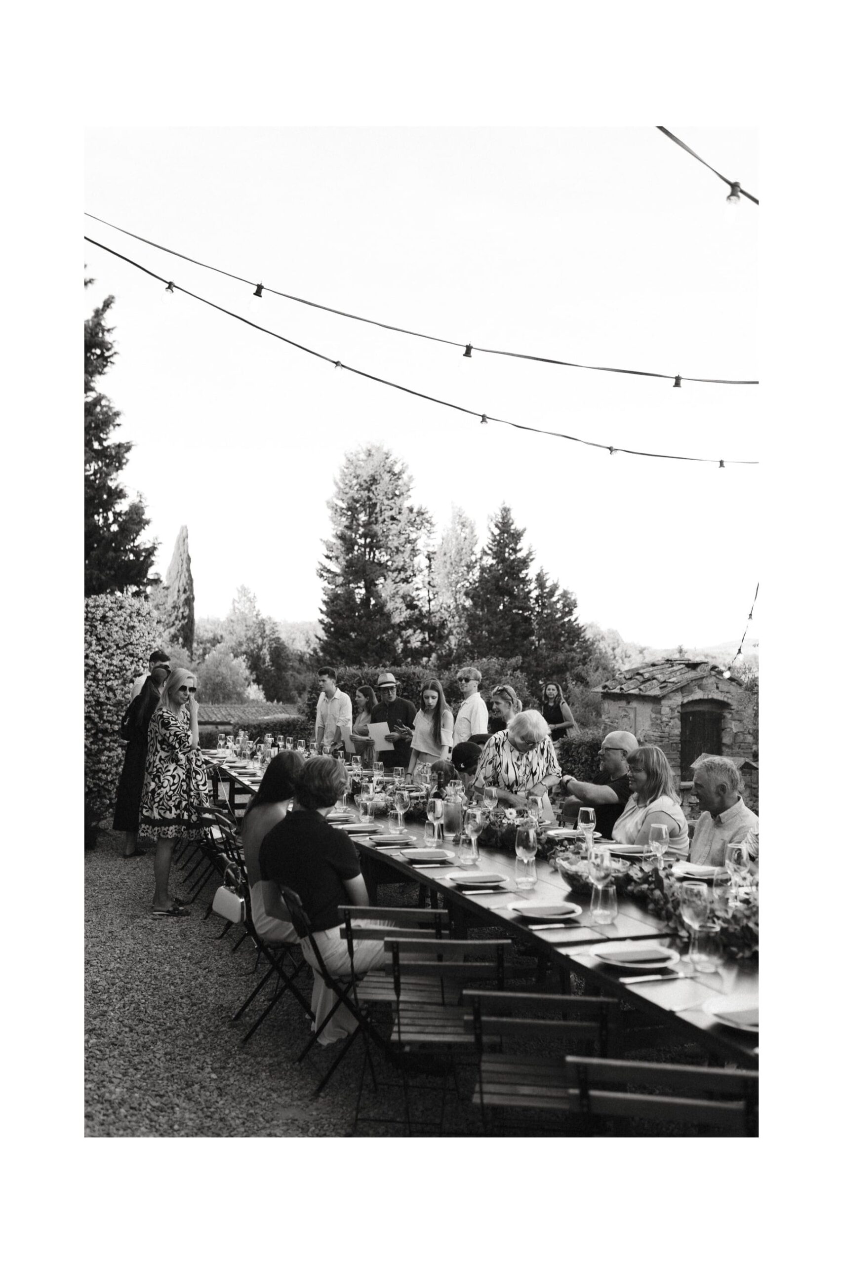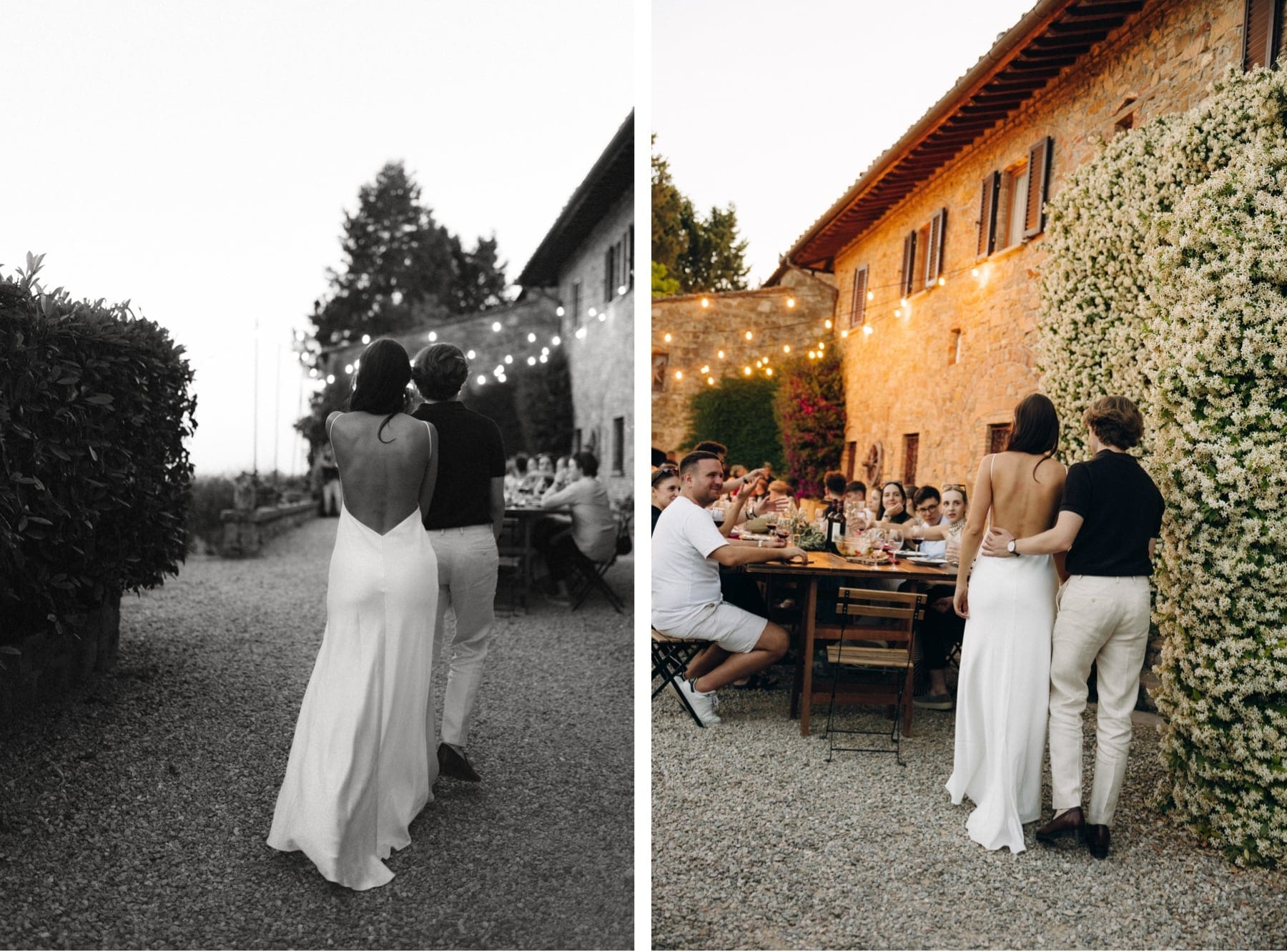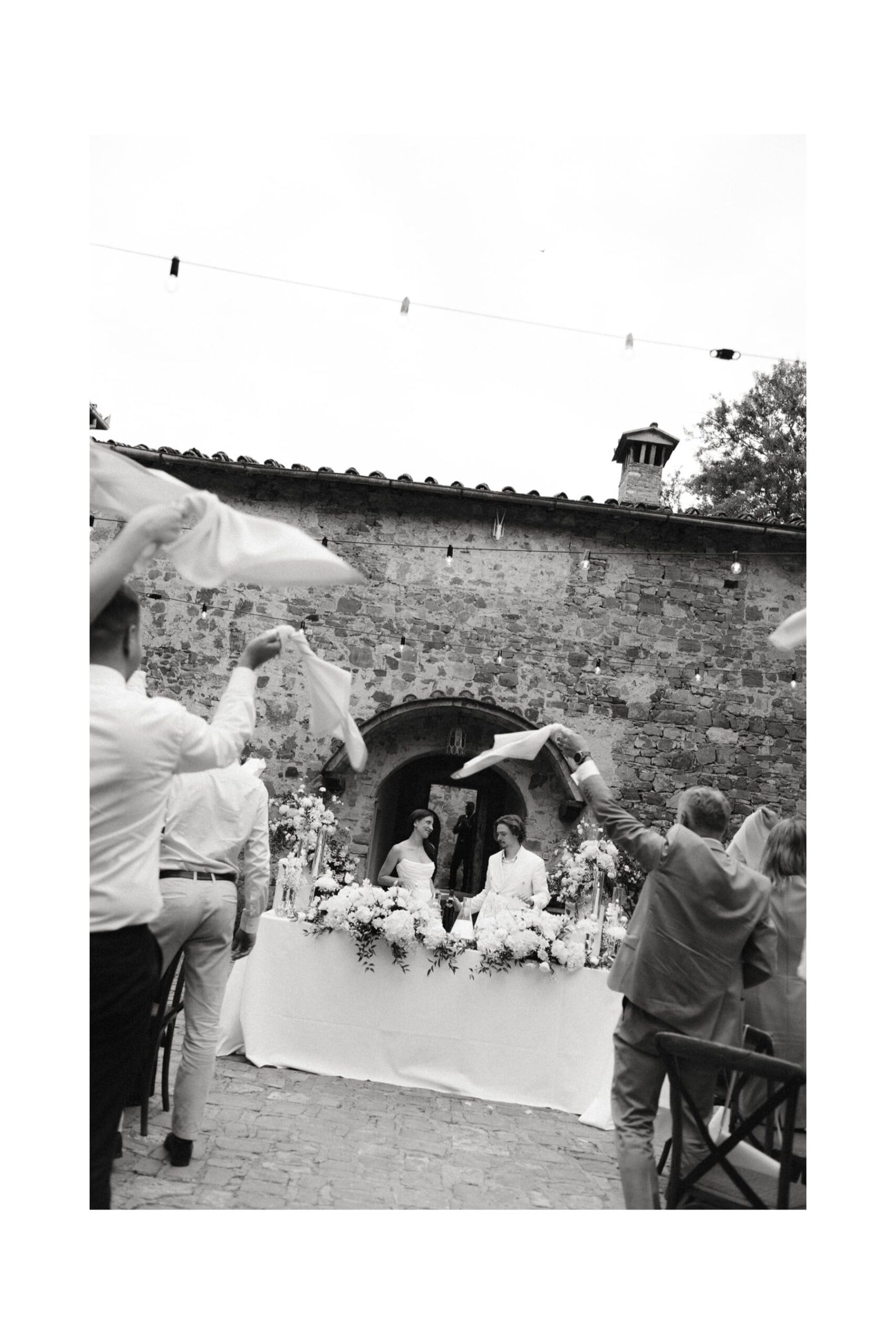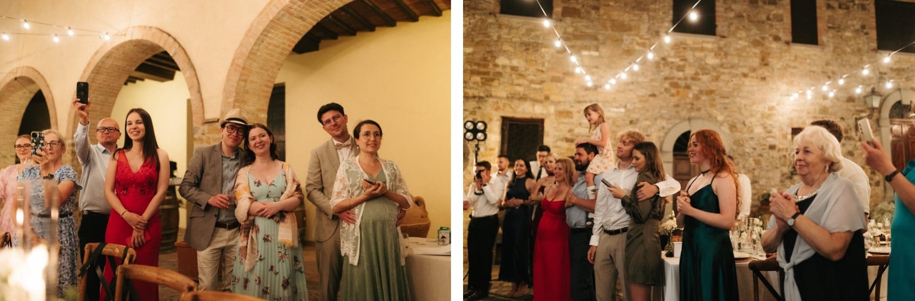 Po ceremonii wszyscy wrócili do Quercia al Poggio, gdzie na dziedzińcu czekały długie stoły, starannie dopracowane detale, światło girland i ciepły wieczór stworzyły klimat, który trudno opisać słowami. Wesele w Toskanii ma swój unikalny rytm – zaczyna się kolacją, rozmowami, winem i celebracją chwili, a dopiero później płynnie przechodzi w zabawę. Nie ma pośpiechu, nie ma napięcia – jest za to pełna obecność i radość. Goście bawili się do późnej nocy, a całe wydarzenie było dokładnie takie, jak powinno wyglądać wesele w Toskanii – naturalne, swobodne i pełne życia.