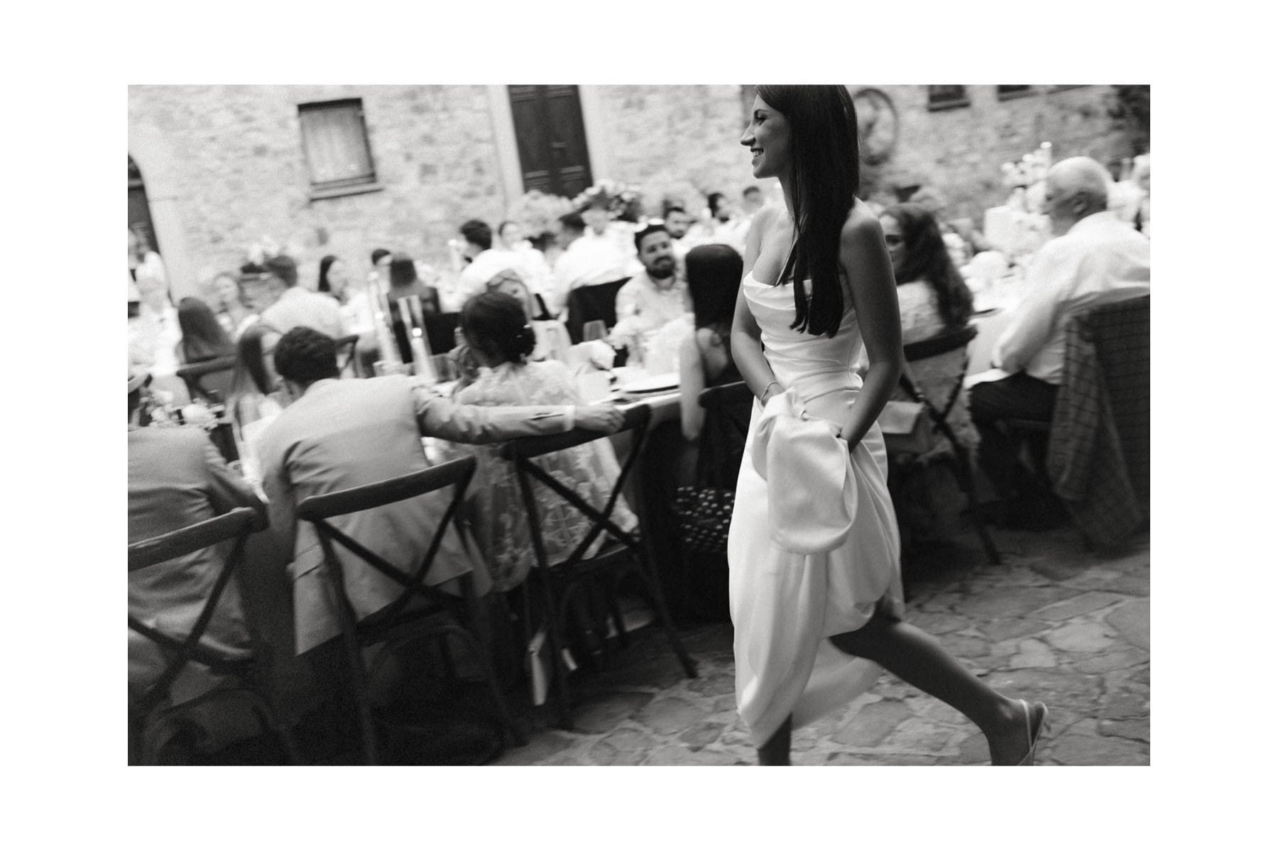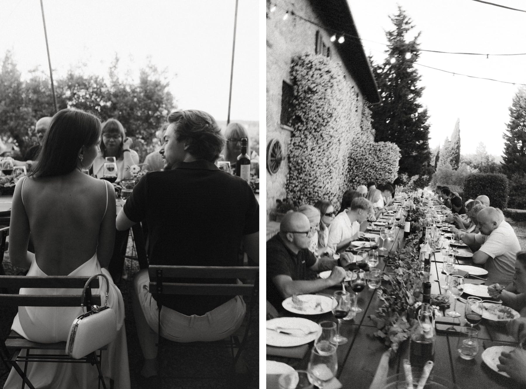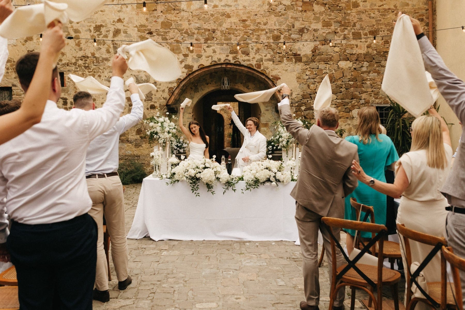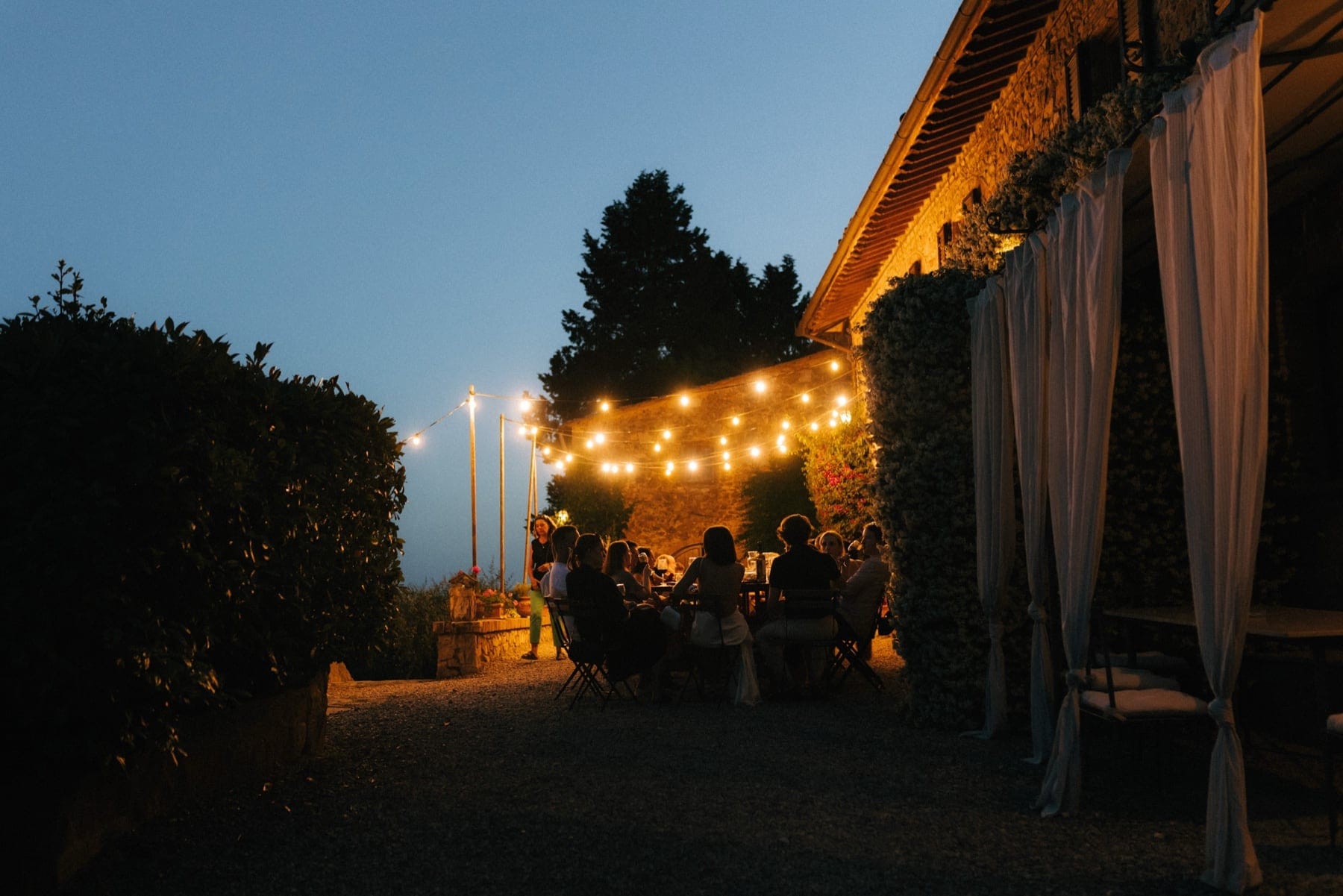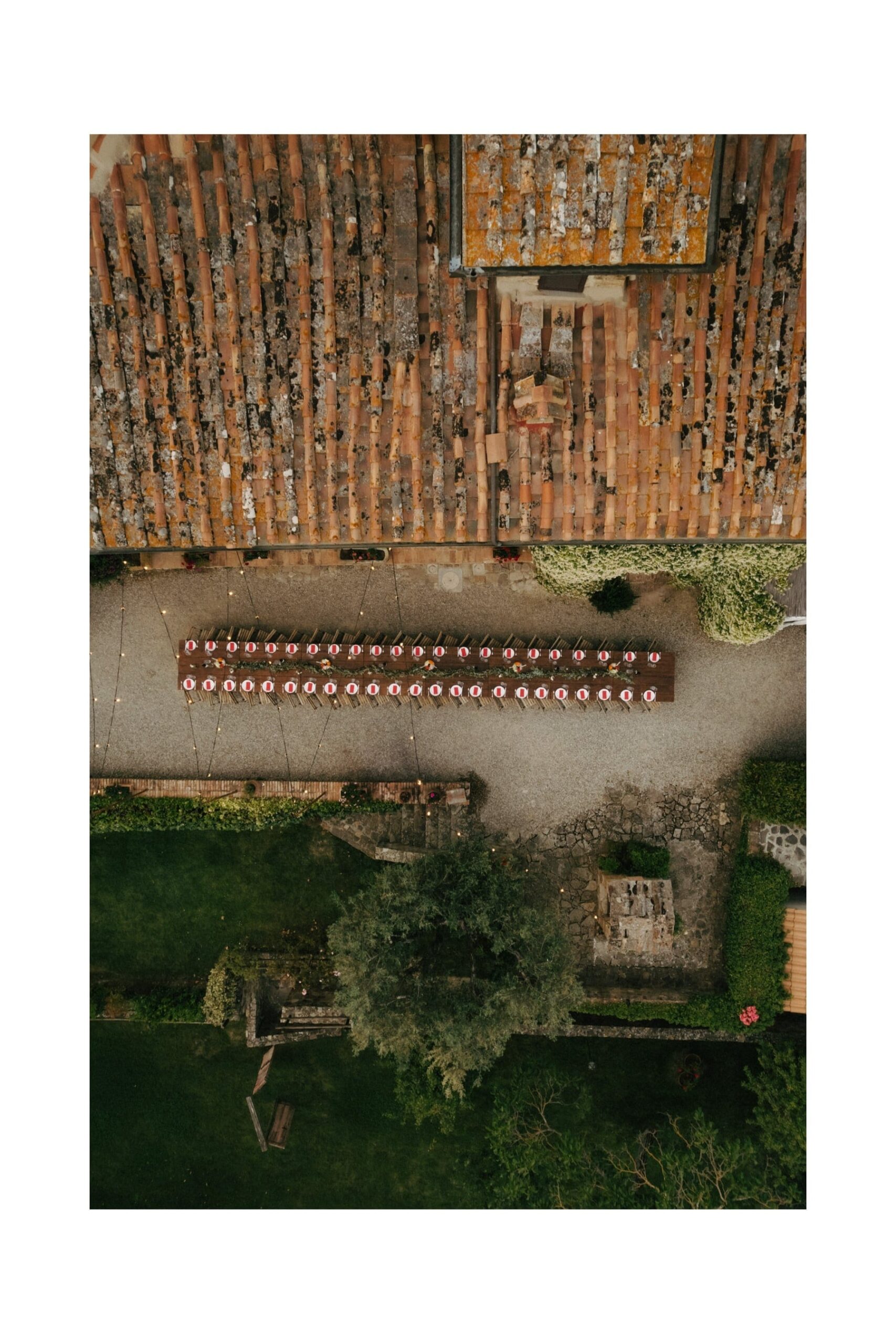 Po ceremonii wszyscy wrócili do Quercia al Poggio, gdzie na dziedzińcu czekały długie stoły, starannie dopracowane detale, światło girland i ciepły wieczór stworzyły klimat, który trudno opisać słowami. Wesele w Toskanii ma swój unikalny rytm – zaczyna się kolacją, rozmowami, winem i celebracją chwili, a dopiero później płynnie przechodzi w zabawę. Nie ma pośpiechu, nie ma napięcia – jest za to pełna obecność i radość. Goście bawili się do późnej nocy, a całe wydarzenie było dokładnie takie, jak powinno wyglądać wesele w Toskanii – naturalne, swobodne i pełne życia.