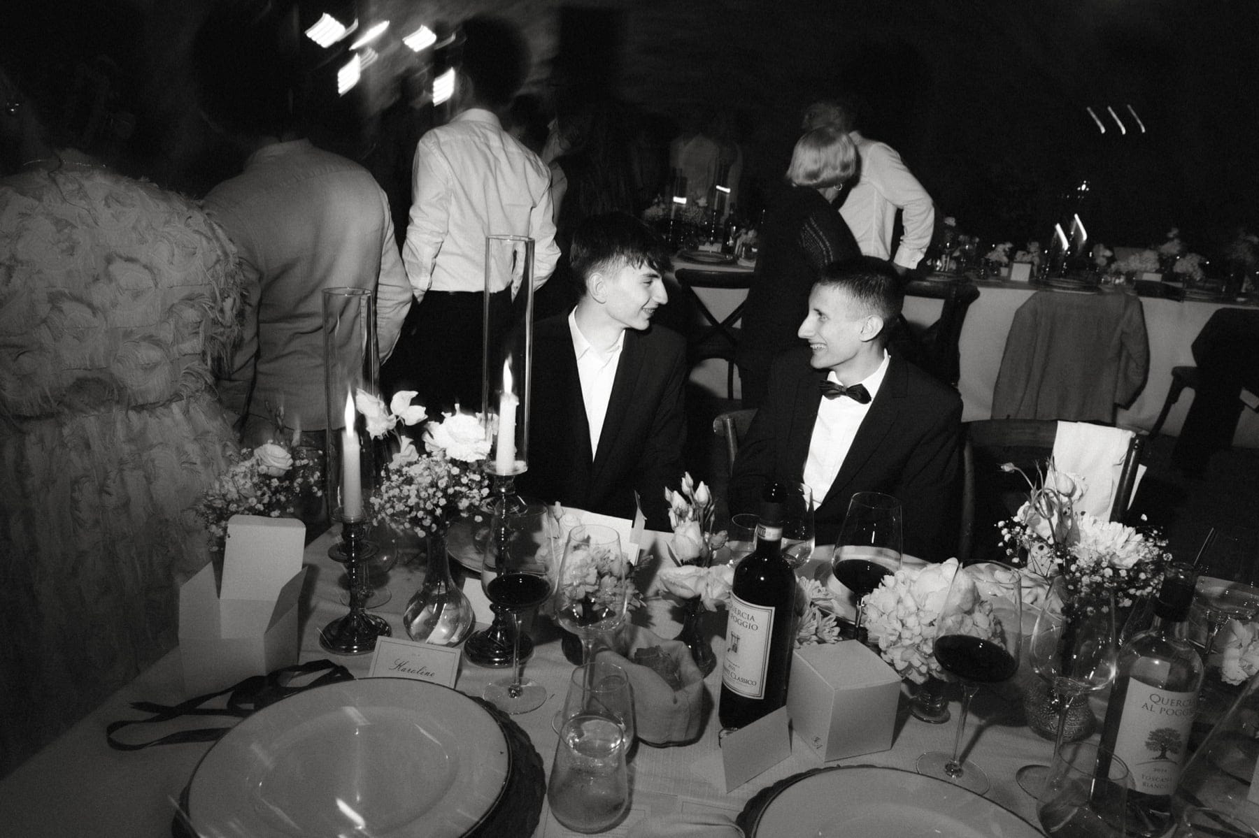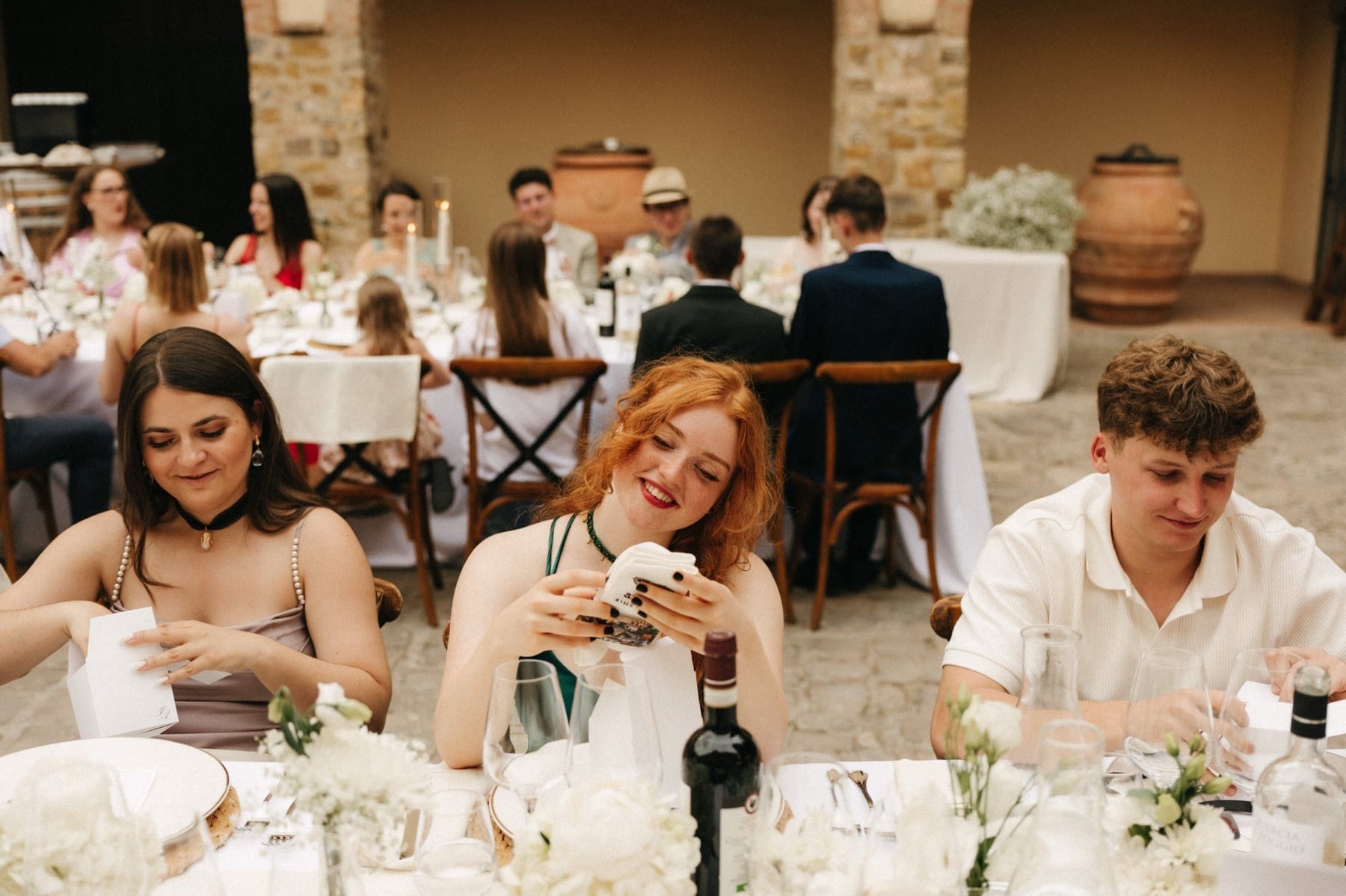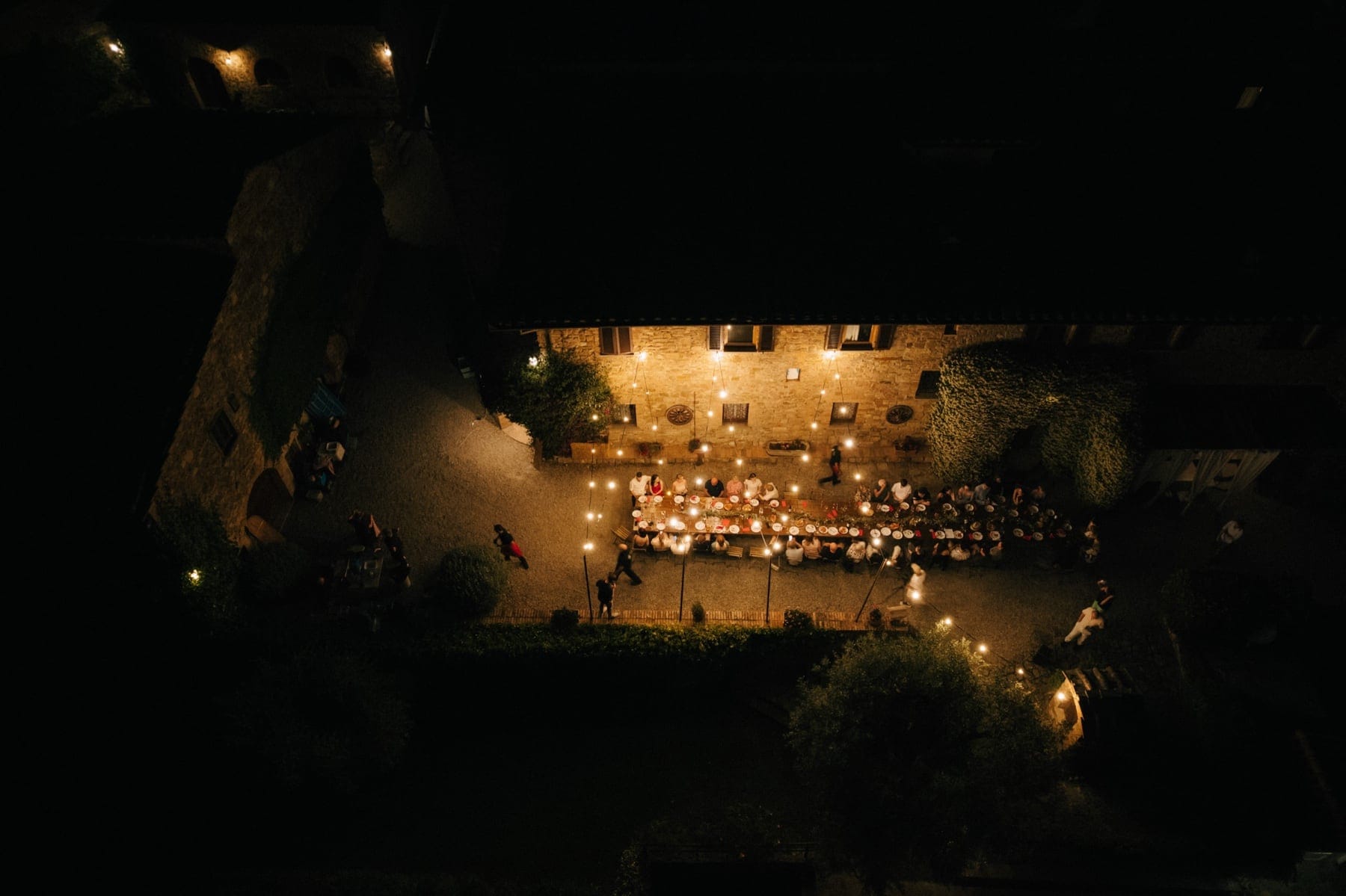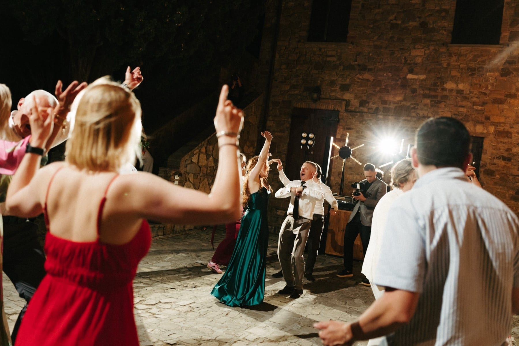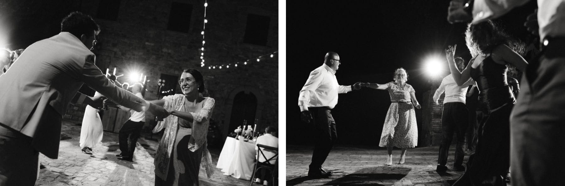 Po ceremonii wszyscy wrócili do Quercia al Poggio, gdzie na dziedzińcu czekały długie stoły, starannie dopracowane detale, światło girland i ciepły wieczór stworzyły klimat, który trudno opisać słowami. Wesele w Toskanii ma swój unikalny rytm – zaczyna się kolacją, rozmowami, winem i celebracją chwili, a dopiero później płynnie przechodzi w zabawę. Nie ma pośpiechu, nie ma napięcia – jest za to pełna obecność i radość. Goście bawili się do późnej nocy, a całe wydarzenie było dokładnie takie, jak powinno wyglądać wesele w Toskanii – naturalne, swobodne i pełne życia.