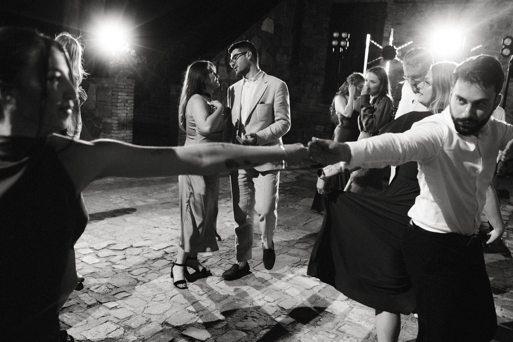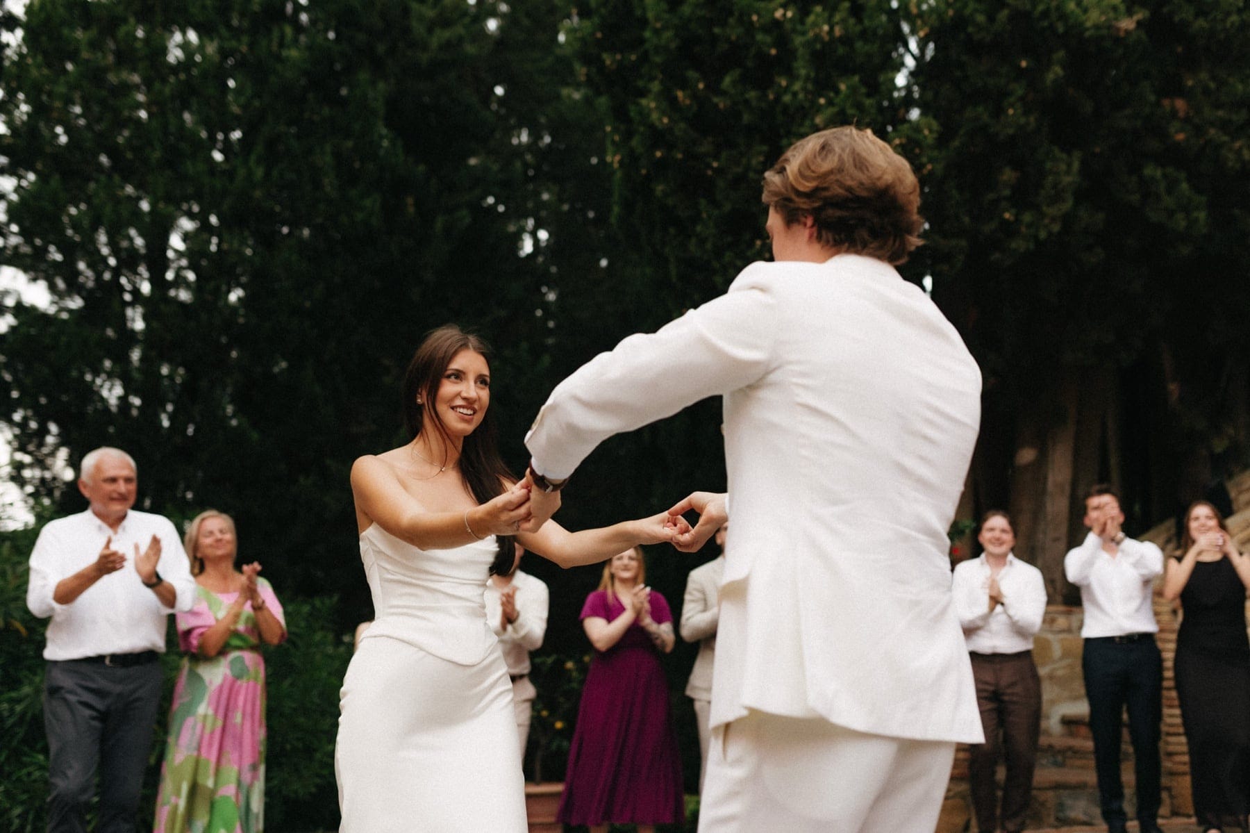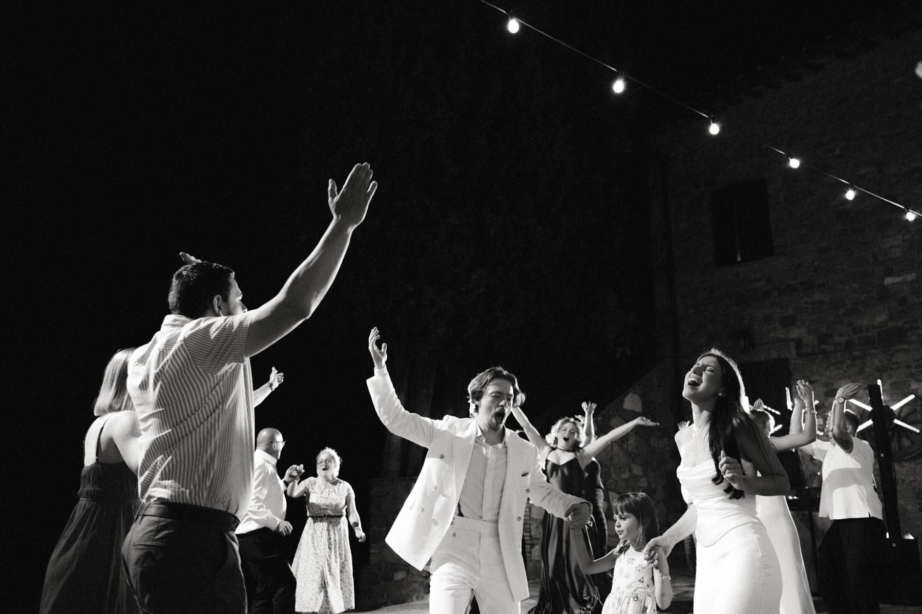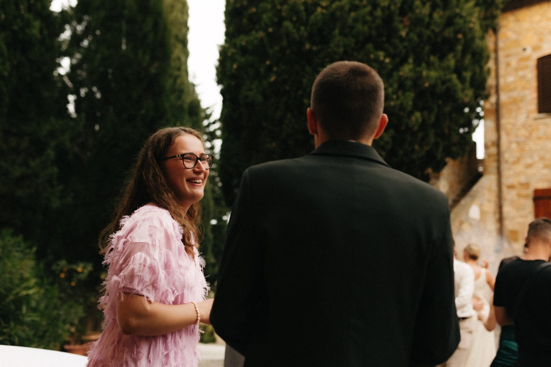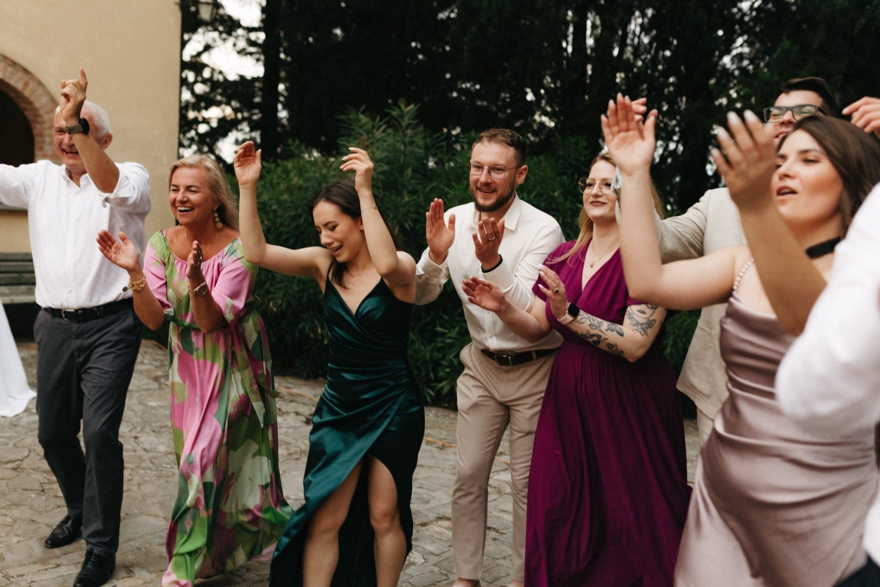 Po ceremonii wszyscy wrócili do Quercia al Poggio, gdzie na dziedzińcu czekały długie stoły, starannie dopracowane detale, światło girland i ciepły wieczór stworzyły klimat, który trudno opisać słowami. Wesele w Toskanii ma swój unikalny rytm – zaczyna się kolacją, rozmowami, winem i celebracją chwili, a dopiero później płynnie przechodzi w zabawę. Nie ma pośpiechu, nie ma napięcia – jest za to pełna obecność i radość. Goście bawili się do późnej nocy, a całe wydarzenie było dokładnie takie, jak powinno wyglądać wesele w Toskanii – naturalne, swobodne i pełne życia.