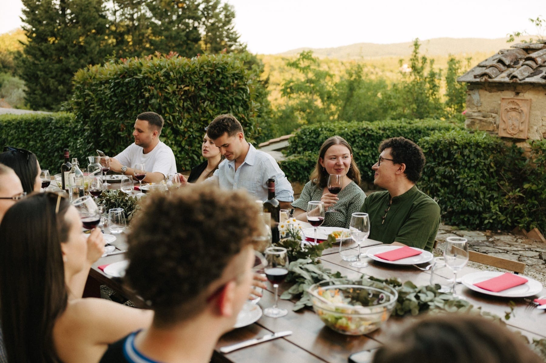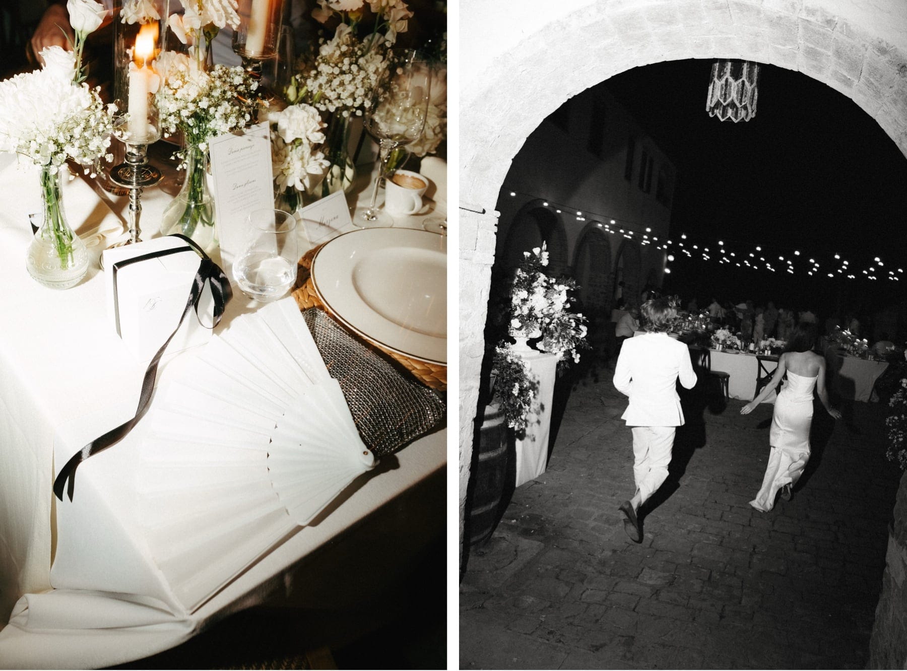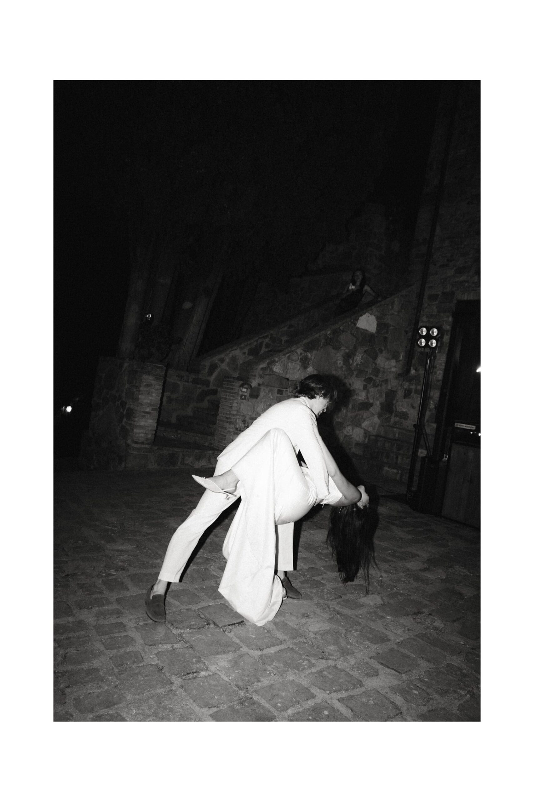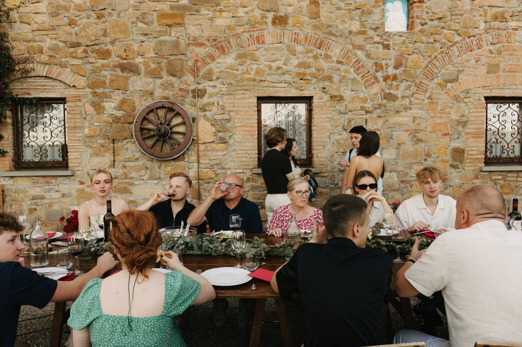 Po ceremonii wszyscy wrócili do Quercia al Poggio, gdzie na dziedzińcu czekały długie stoły, starannie dopracowane detale, światło girland i ciepły wieczór stworzyły klimat, który trudno opisać słowami. Wesele w Toskanii ma swój unikalny rytm – zaczyna się kolacją, rozmowami, winem i celebracją chwili, a dopiero później płynnie przechodzi w zabawę. Nie ma pośpiechu, nie ma napięcia – jest za to pełna obecność i radość. Goście bawili się do późnej nocy, a całe wydarzenie było dokładnie takie, jak powinno wyglądać wesele w Toskanii – naturalne, swobodne i pełne życia.