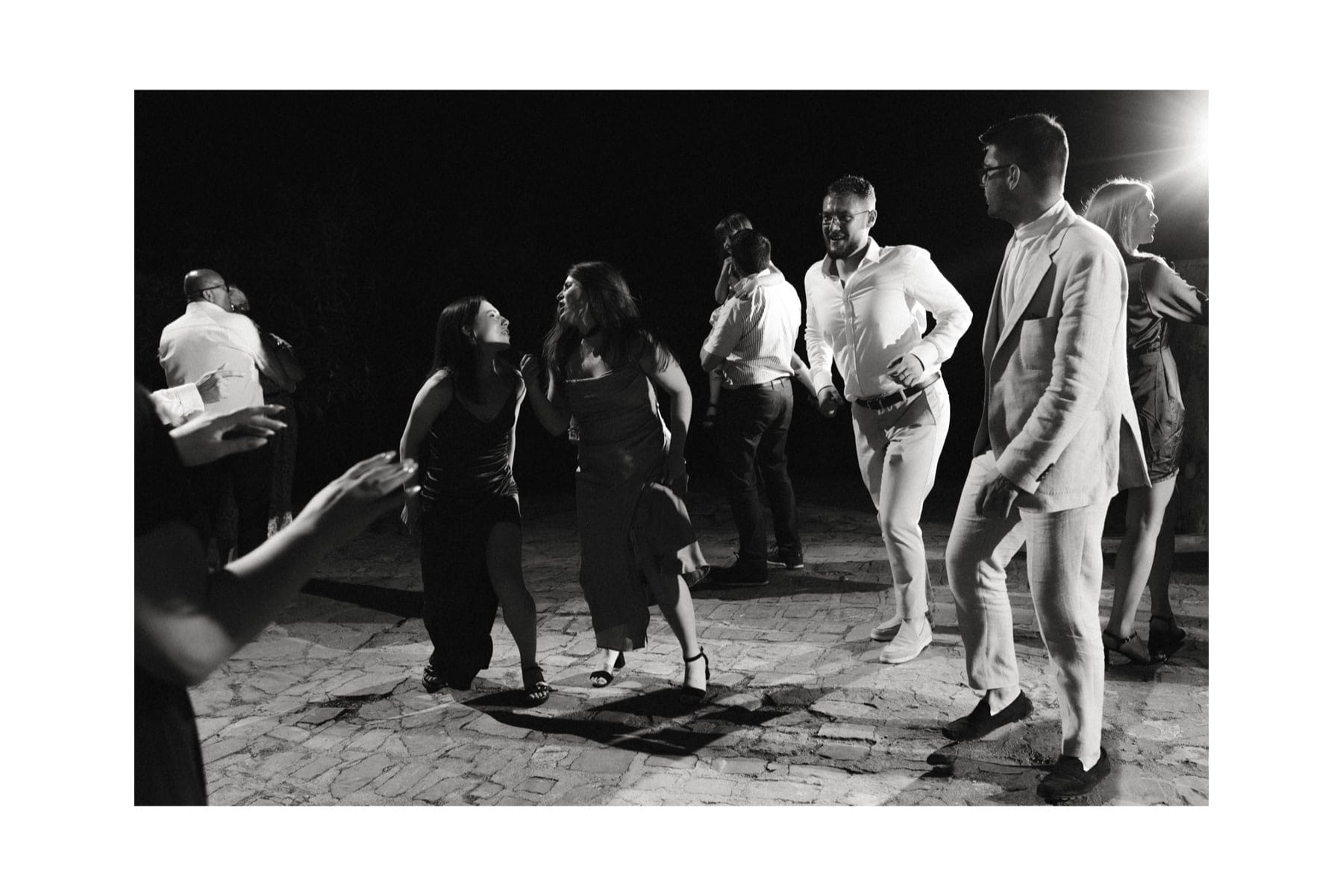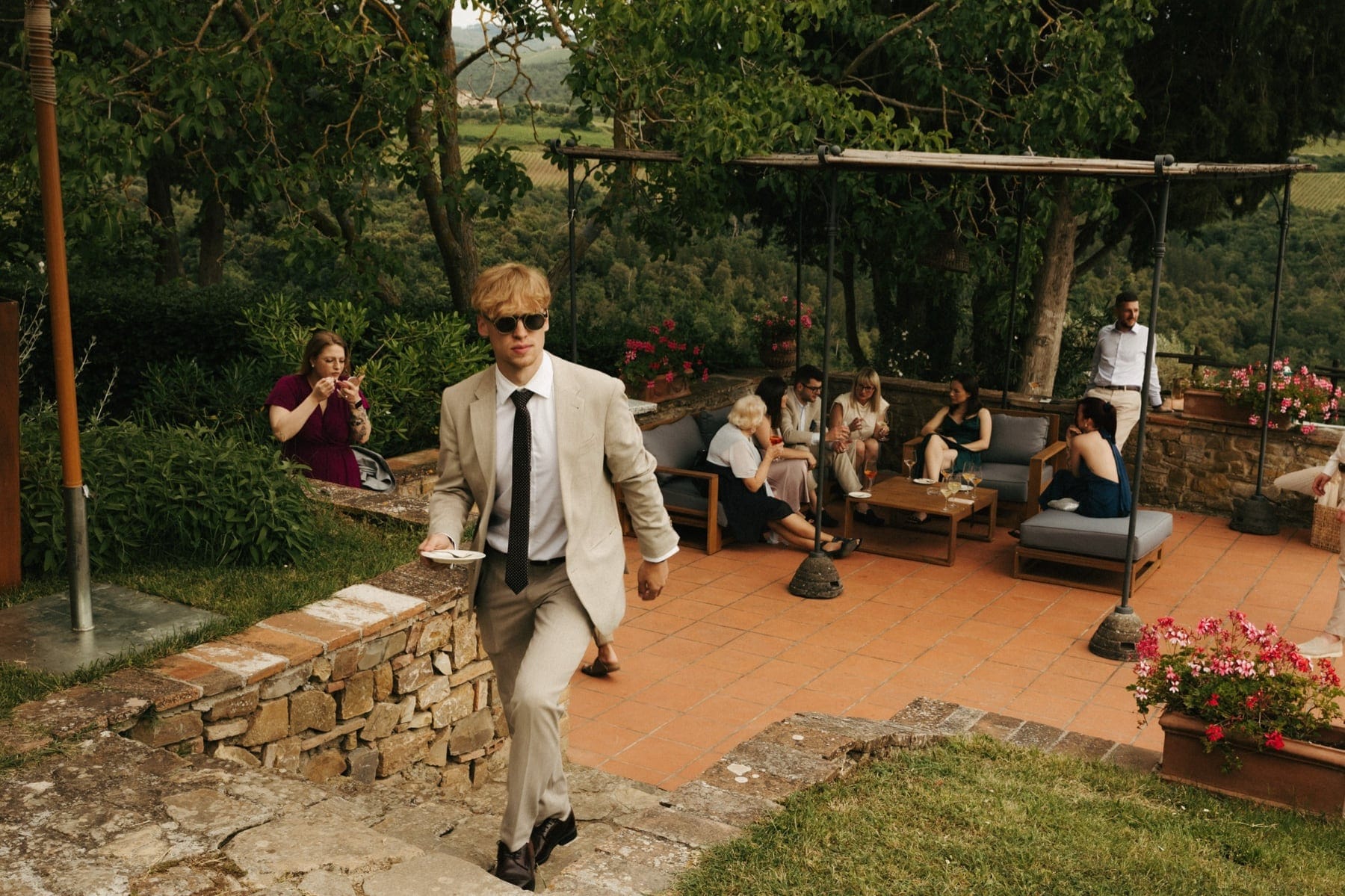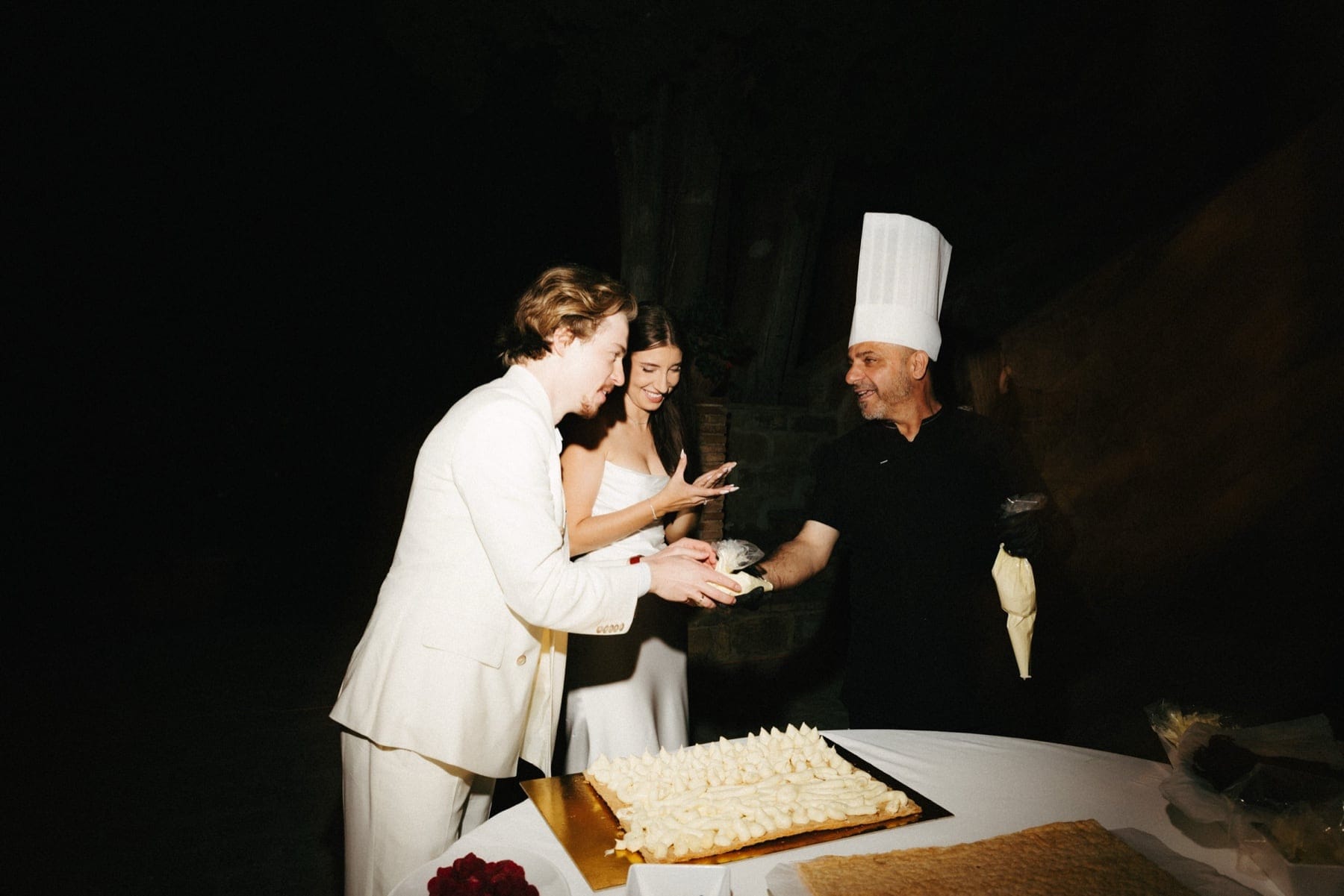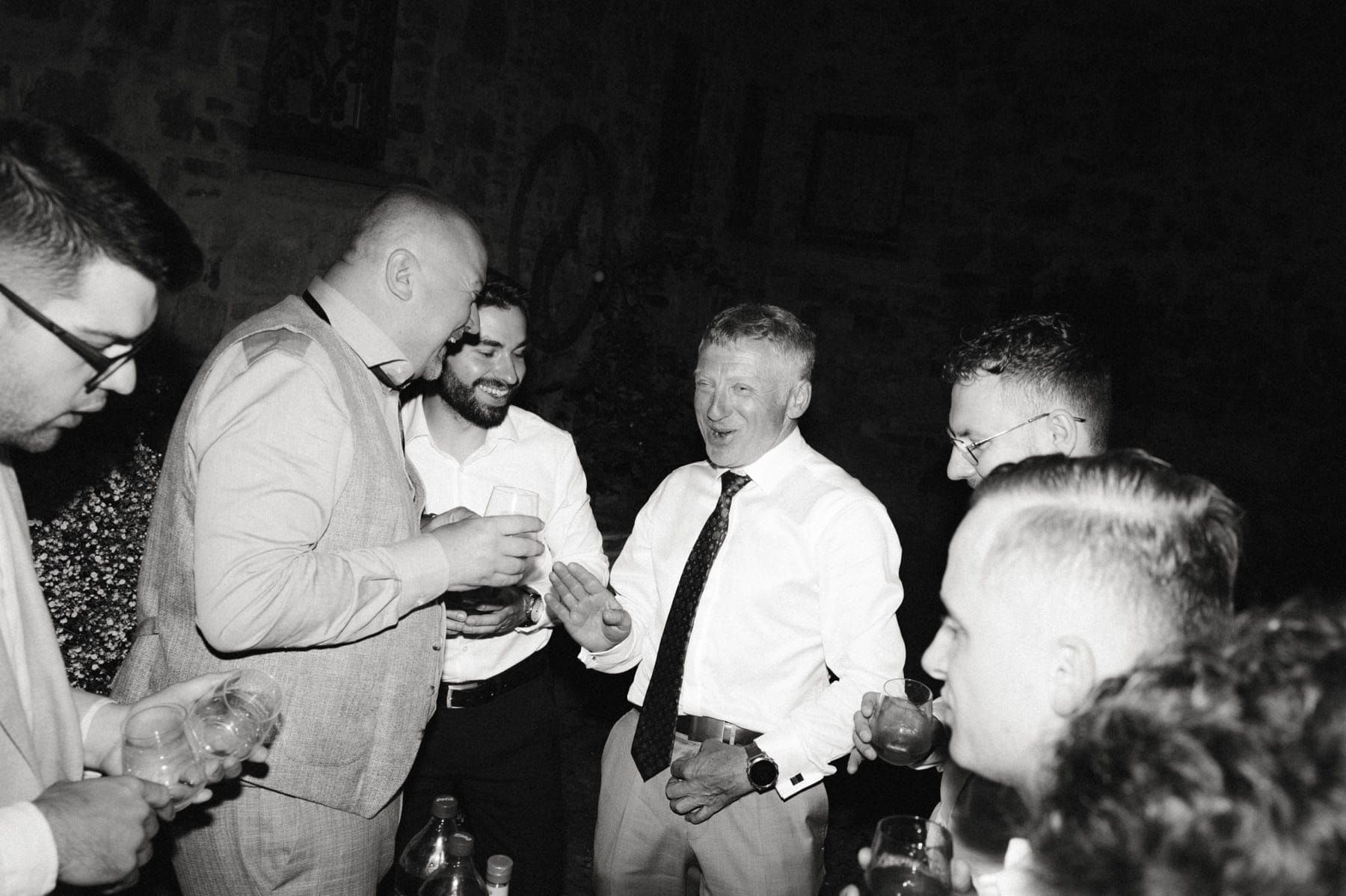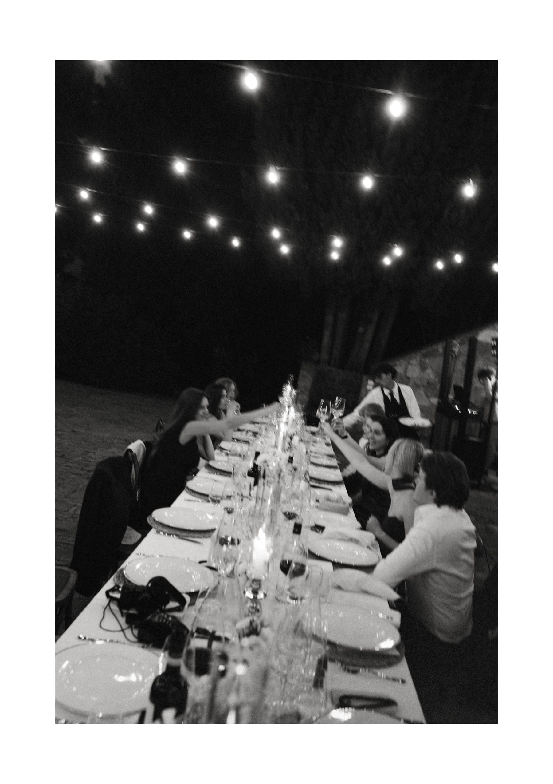 Po ceremonii wszyscy wrócili do Quercia al Poggio, gdzie na dziedzińcu czekały długie stoły, starannie dopracowane detale, światło girland i ciepły wieczór stworzyły klimat, który trudno opisać słowami. Wesele w Toskanii ma swój unikalny rytm – zaczyna się kolacją, rozmowami, winem i celebracją chwili, a dopiero później płynnie przechodzi w zabawę. Nie ma pośpiechu, nie ma napięcia – jest za to pełna obecność i radość. Goście bawili się do późnej nocy, a całe wydarzenie było dokładnie takie, jak powinno wyglądać wesele w Toskanii – naturalne, swobodne i pełne życia.