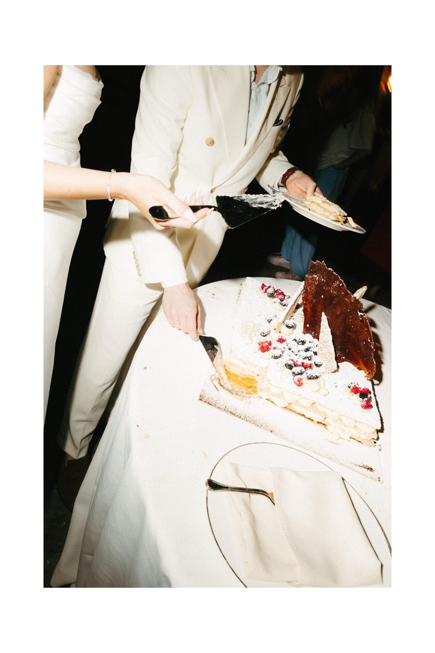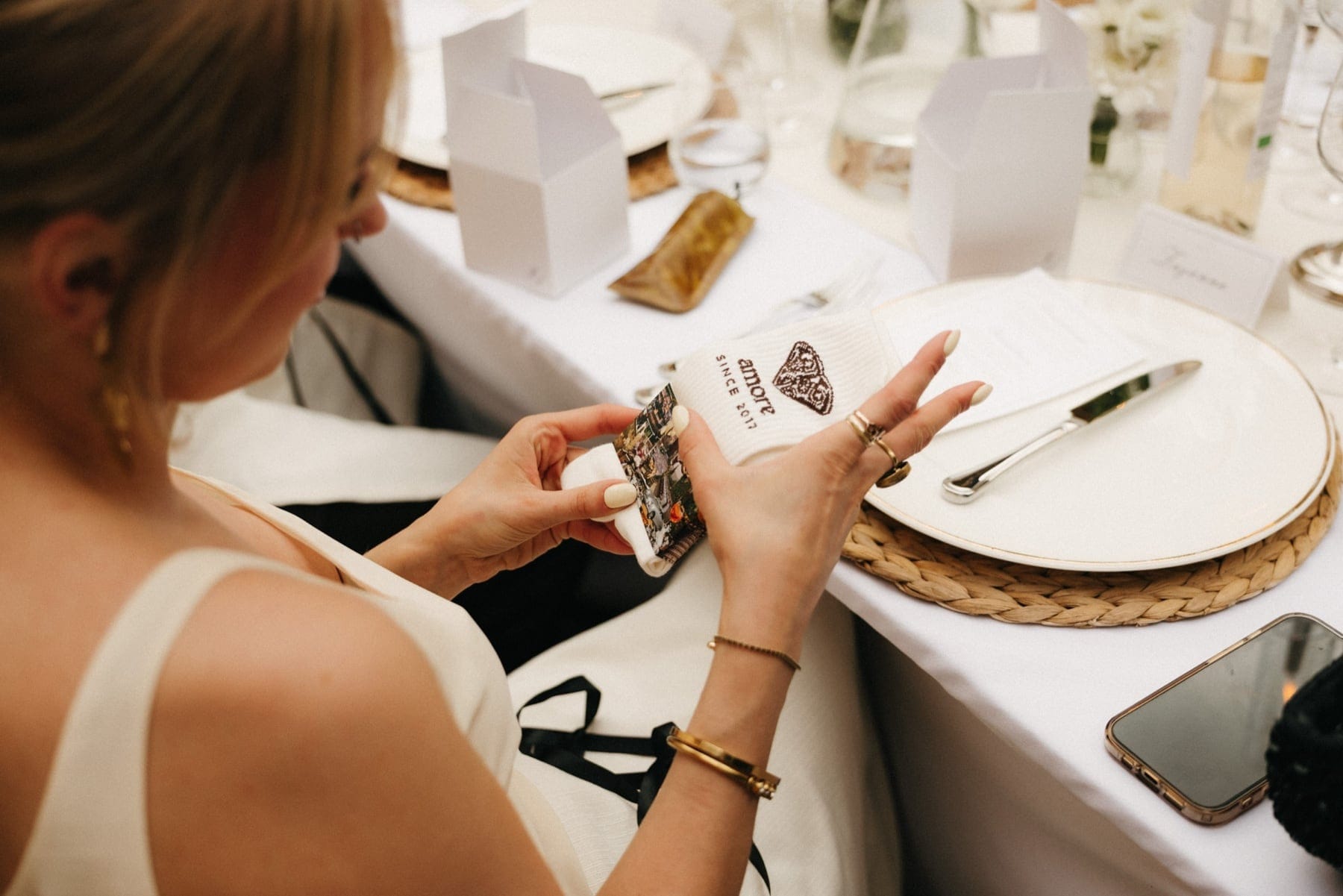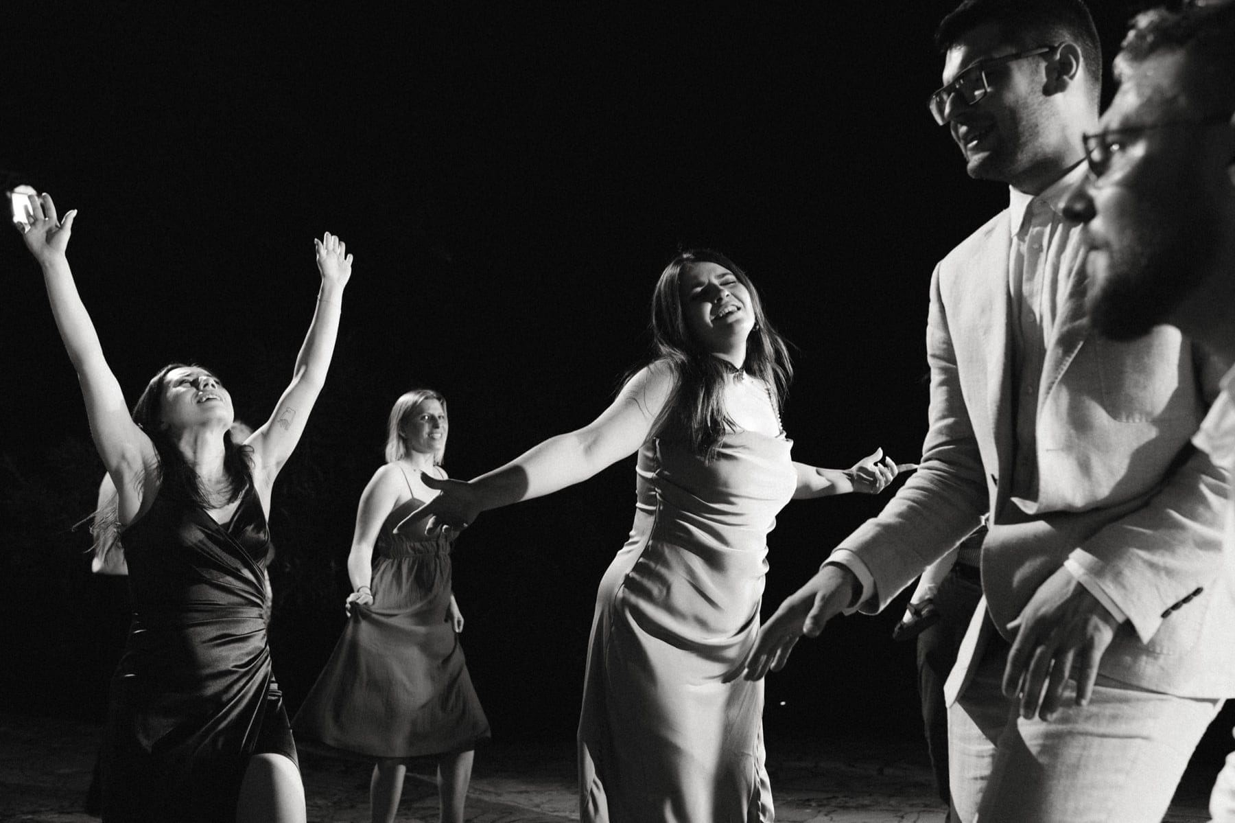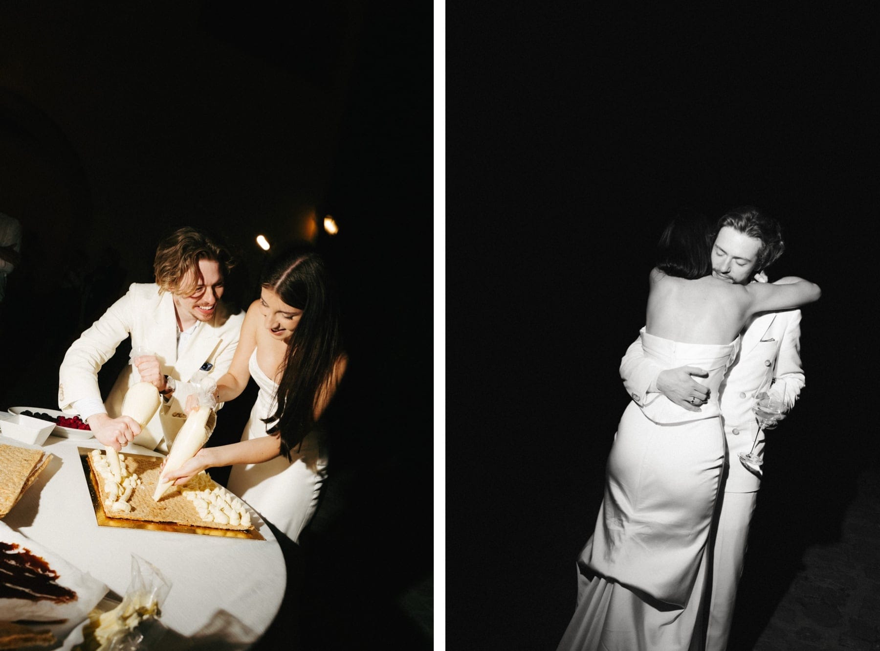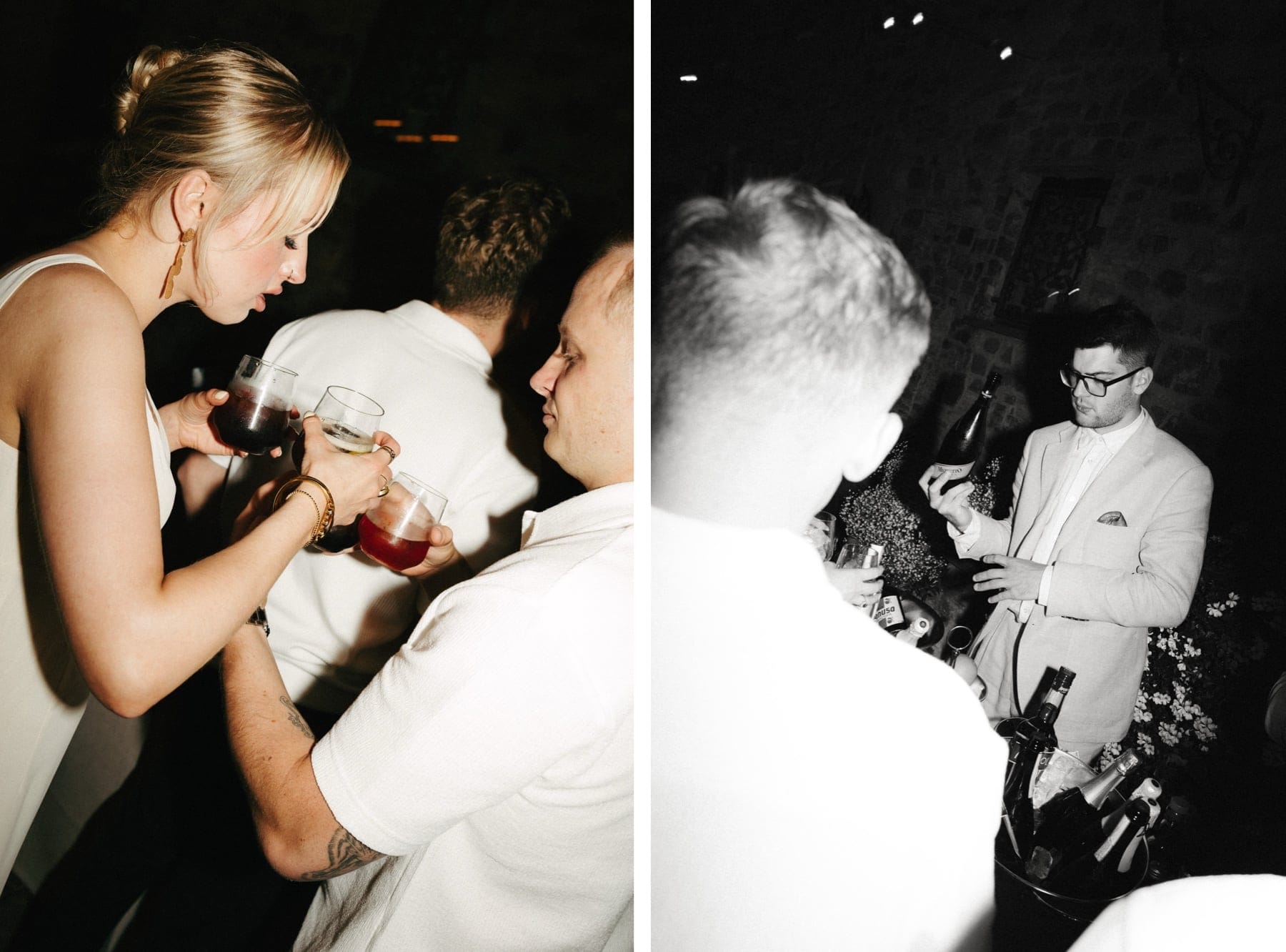 Po ceremonii wszyscy wrócili do Quercia al Poggio, gdzie na dziedzińcu czekały długie stoły, starannie dopracowane detale, światło girland i ciepły wieczór stworzyły klimat, który trudno opisać słowami. Wesele w Toskanii ma swój unikalny rytm – zaczyna się kolacją, rozmowami, winem i celebracją chwili, a dopiero później płynnie przechodzi w zabawę. Nie ma pośpiechu, nie ma napięcia – jest za to pełna obecność i radość. Goście bawili się do późnej nocy, a całe wydarzenie było dokładnie takie, jak powinno wyglądać wesele w Toskanii – naturalne, swobodne i pełne życia.