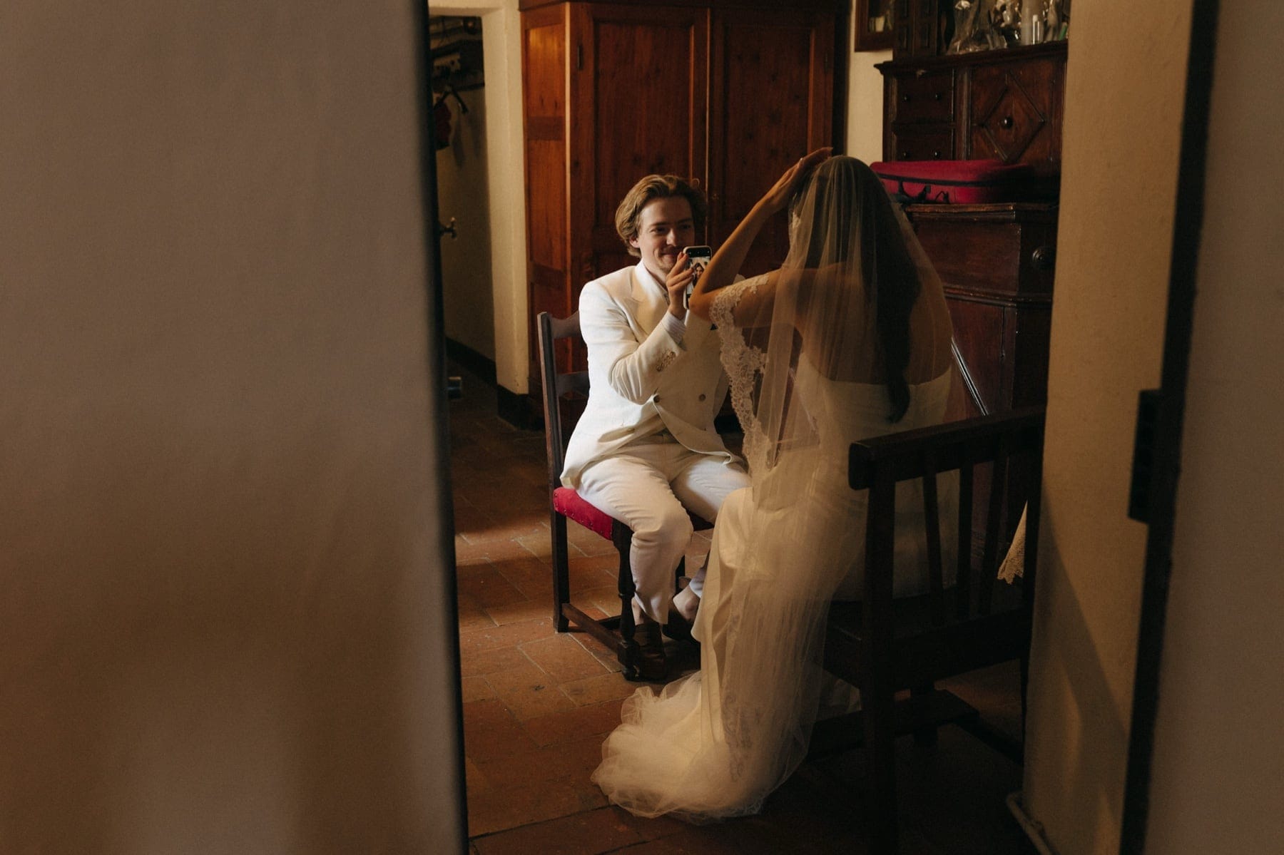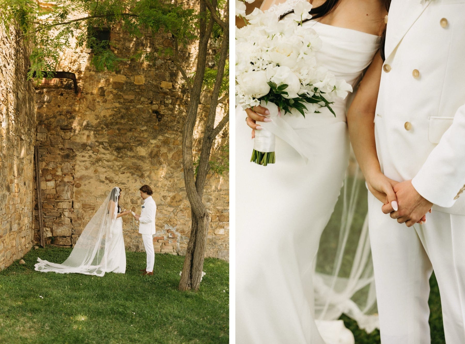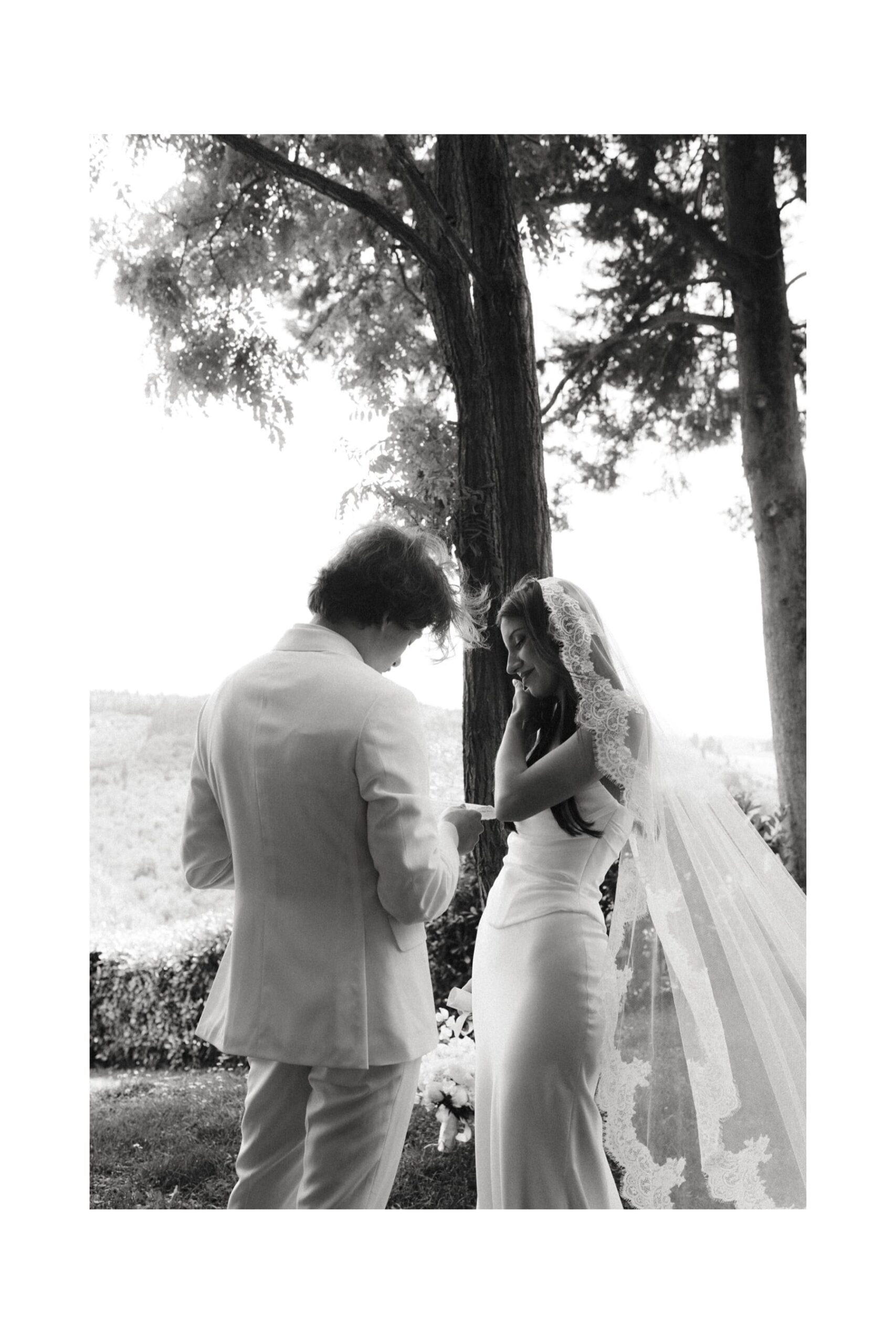 Kolejnego dnia para młoda rozpoczęła przygotowania w Quercia al Poggio – miejscu, które idealnie oddaje klimat ślubu w Toskanii. Cisza, natura i przestrzeń sprawiają, że wszystko dzieje się spokojniej i bardziej świadomie. First look odbył się na terenie posiadłości i był jednym z najbardziej wzruszających momentów całego dnia. Para nie tylko zobaczyła się po raz pierwszy, ale również odczytała swoje listy. Takie chwile to esencja tego, czym jest ślub we Włoszech – prawdziwe emocje, bez pośpiechu i presji.