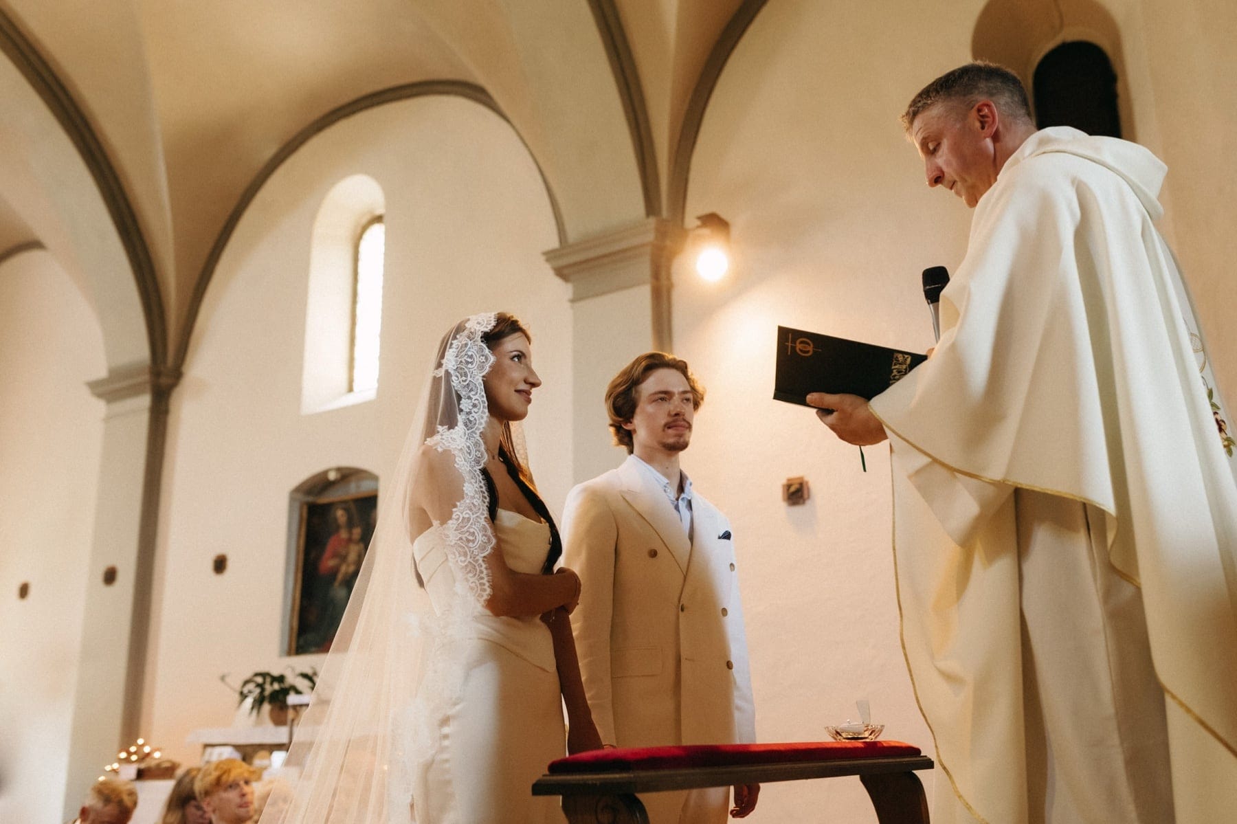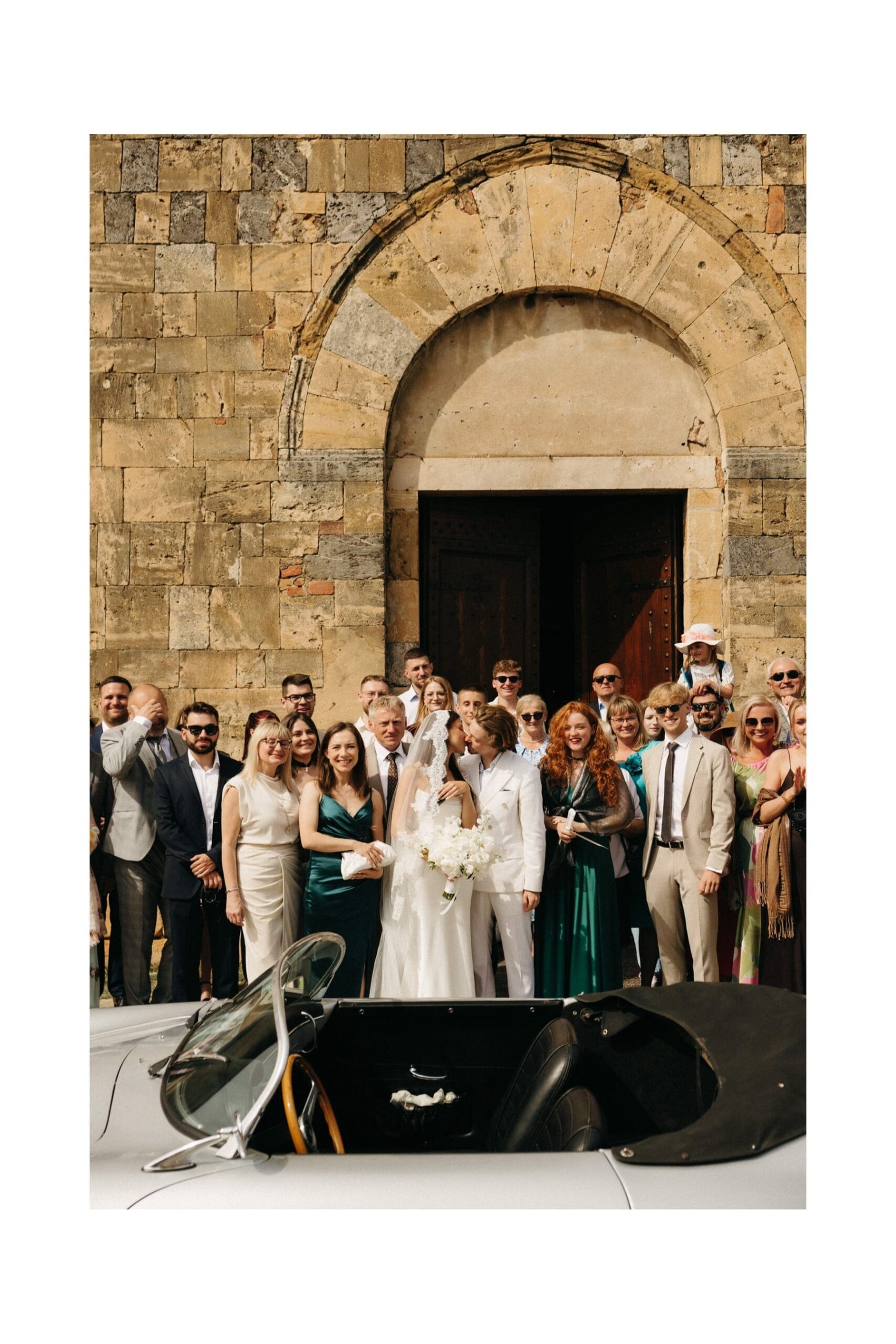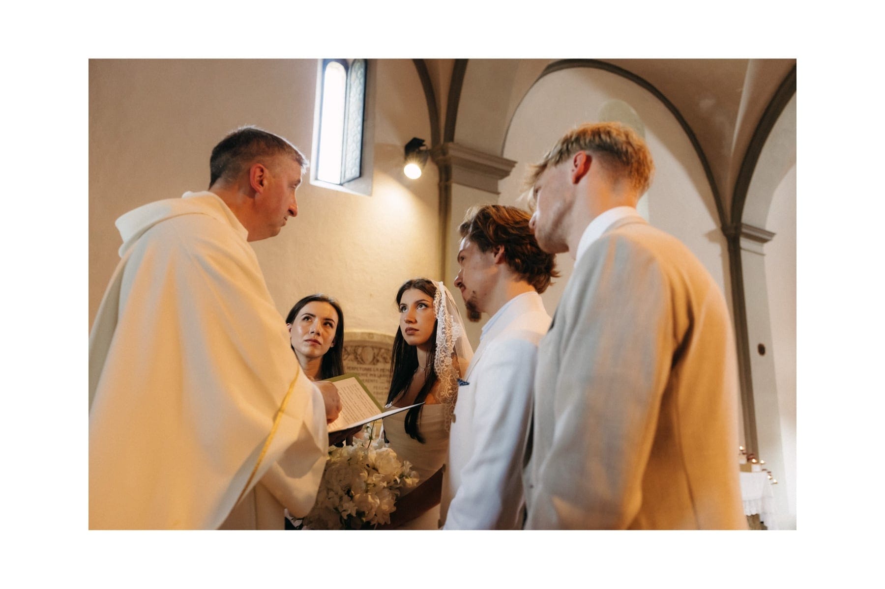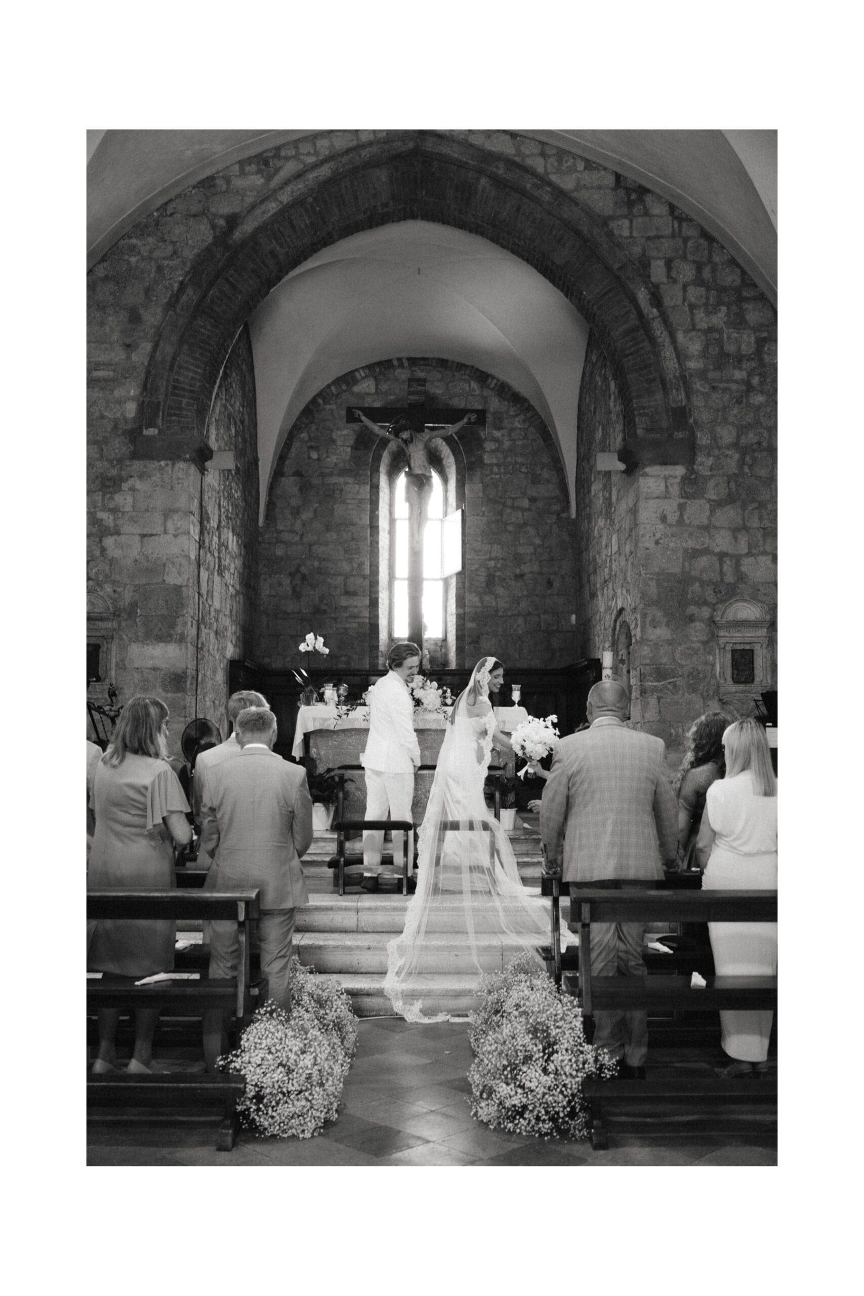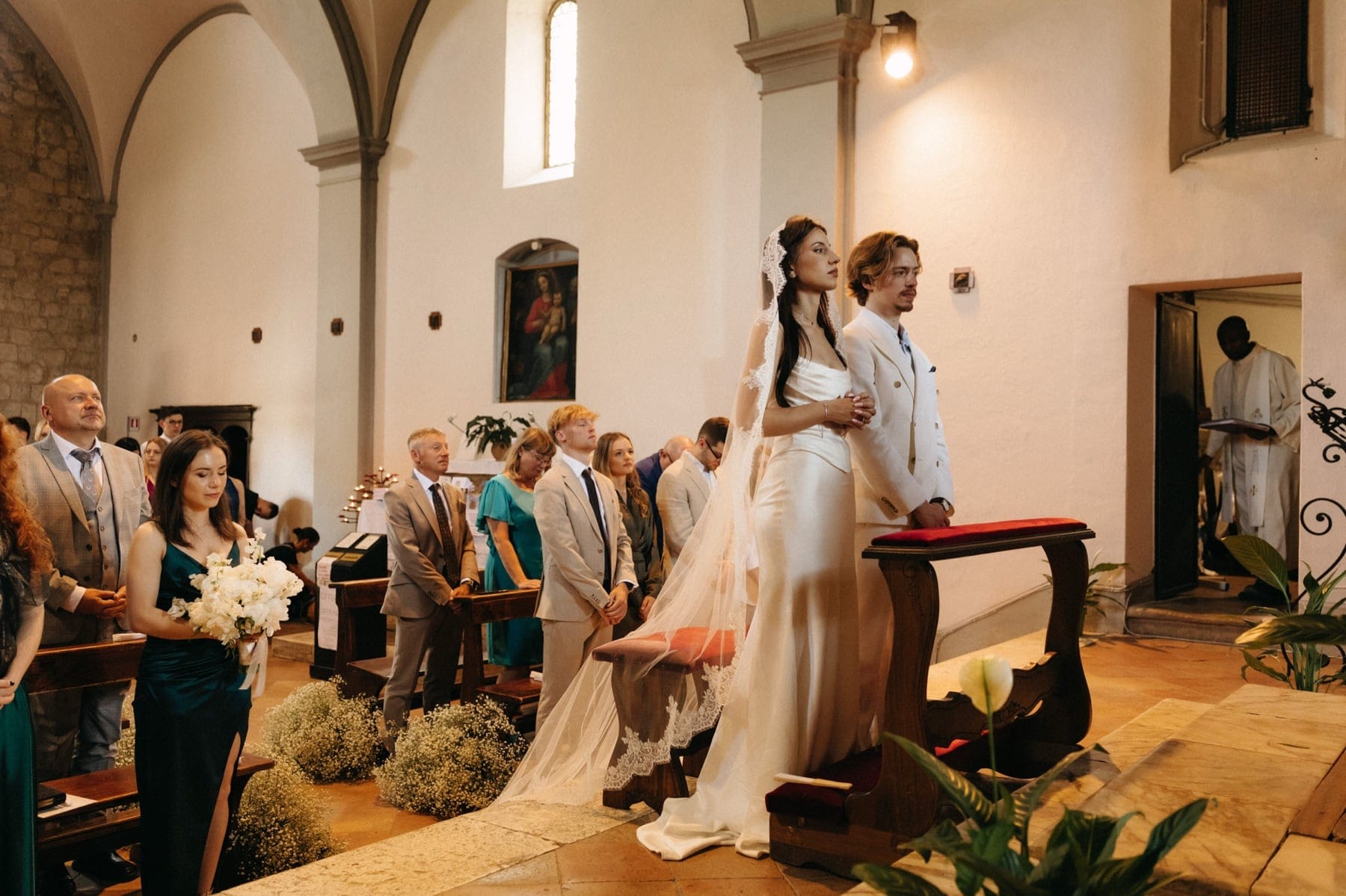Ceremonia ślubna odbyła się w pobliskim, kameralnym kościółku, co jest bardzo częstym wyborem przy organizacji ślubu we Włoszech. To połączenie tradycji z późniejszym, swobodnym weselem w Toskanii daje idealny balans. Wnętrze kościoła, kameralność, naturalne światło i bliskość najważniejszych osób stworzyły niezwykle intymną atmosferę. Ślub we Włoszech często wyróżnia się właśnie tym – prostotą, autentycznością i ogromnym ładunkiem emocjonalnym.