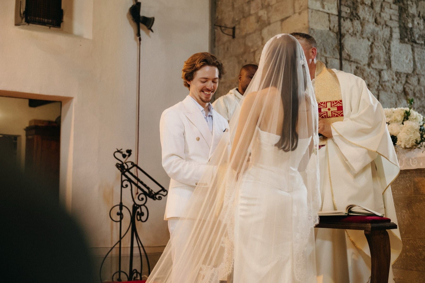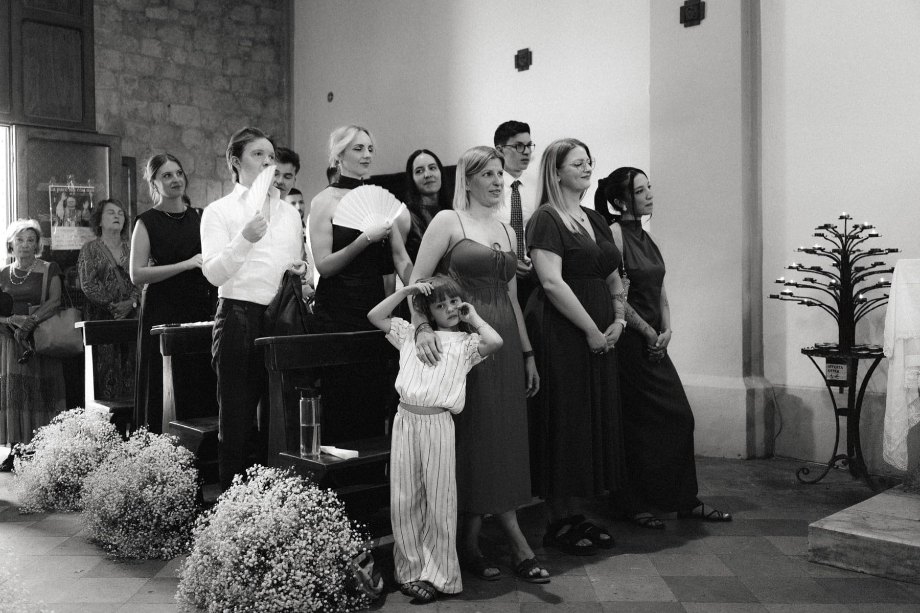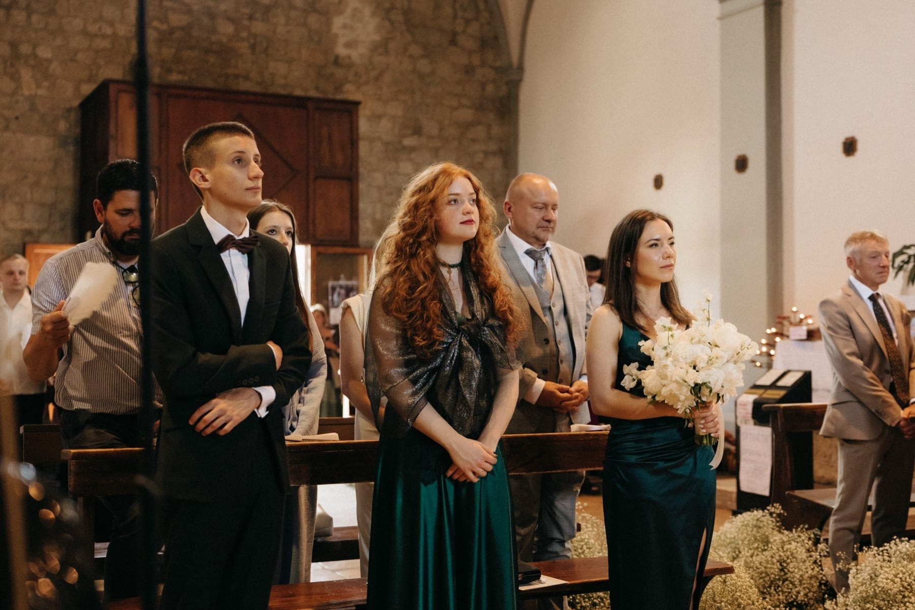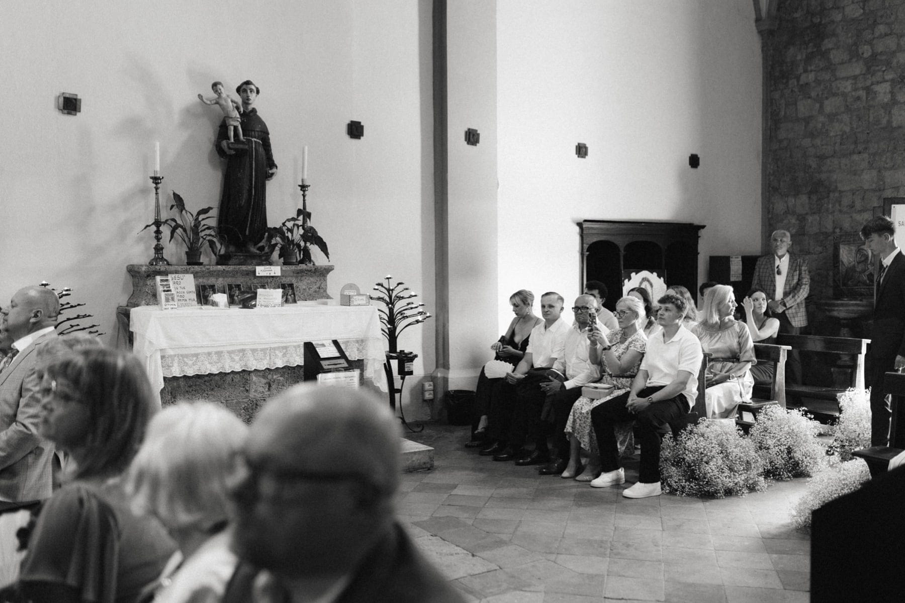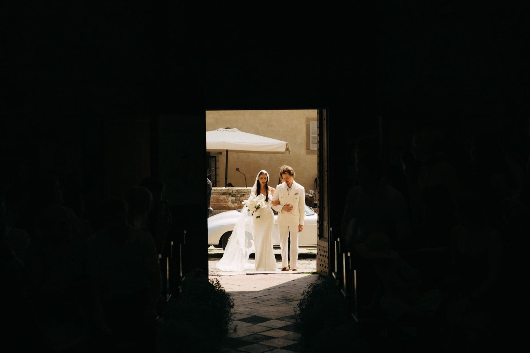 Ceremonia ślubna odbyła się w pobliskim, kameralnym kościółku, co jest bardzo częstym wyborem przy organizacji ślubu we Włoszech. To połączenie tradycji z późniejszym, swobodnym weselem w Toskanii daje idealny balans. Wnętrze kościoła, kameralność, naturalne światło i bliskość najważniejszych osób stworzyły niezwykle intymną atmosferę. Ślub we Włoszech często wyróżnia się właśnie tym – prostotą, autentycznością i ogromnym ładunkiem emocjonalnym.