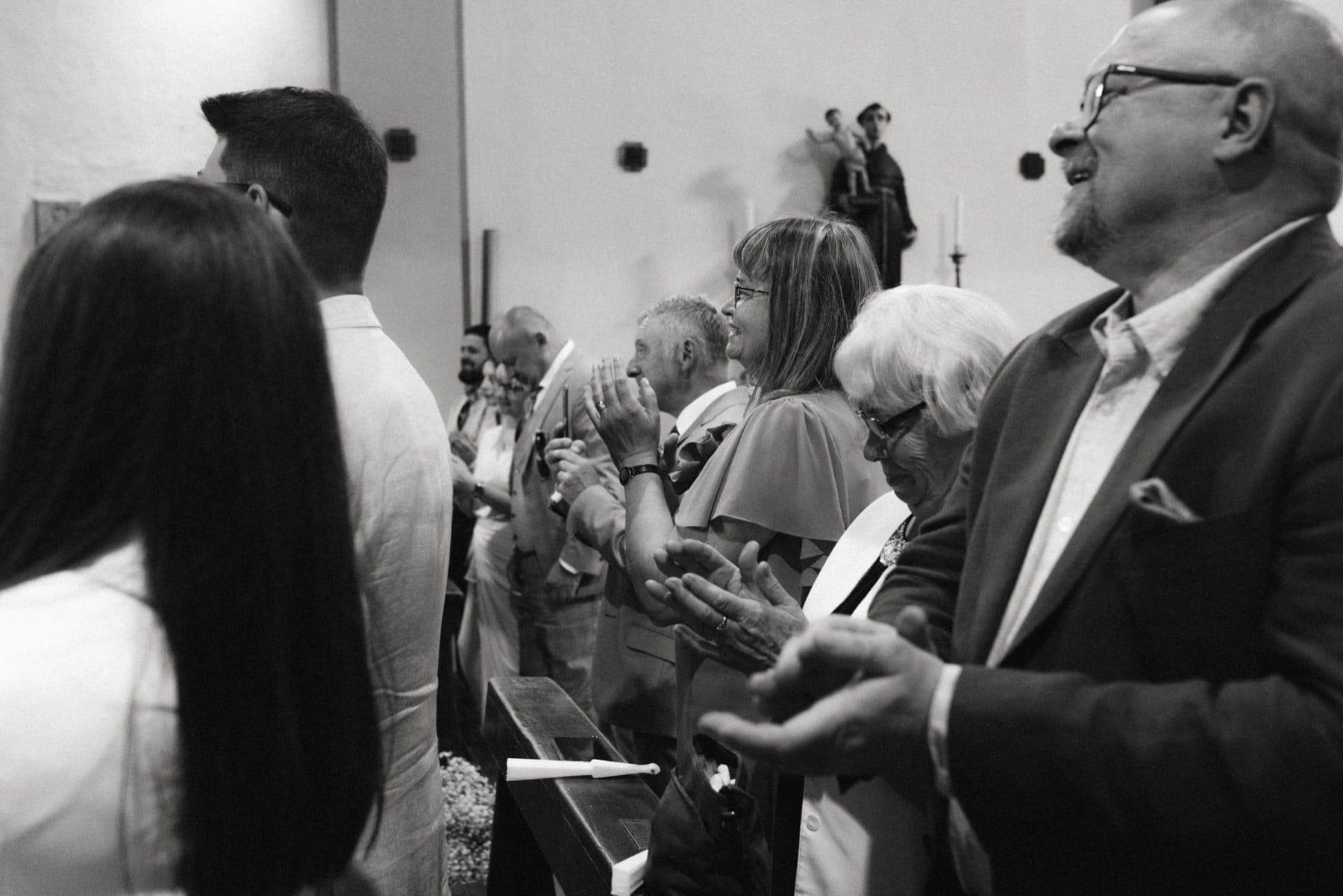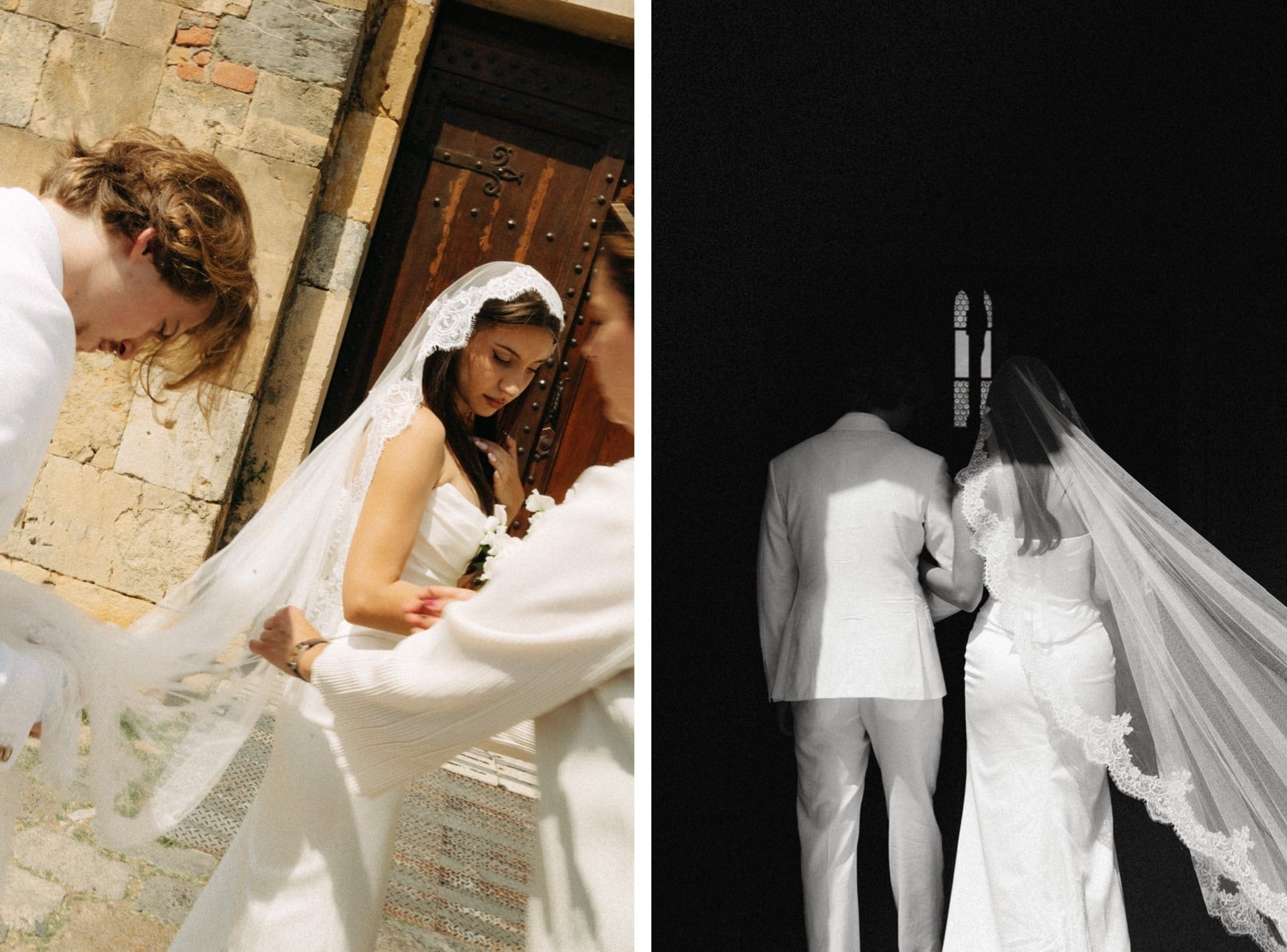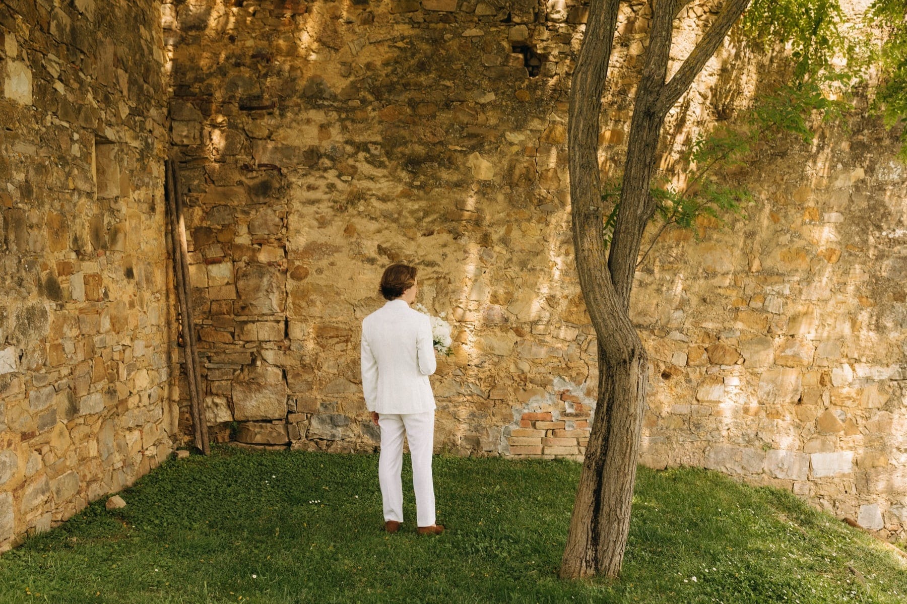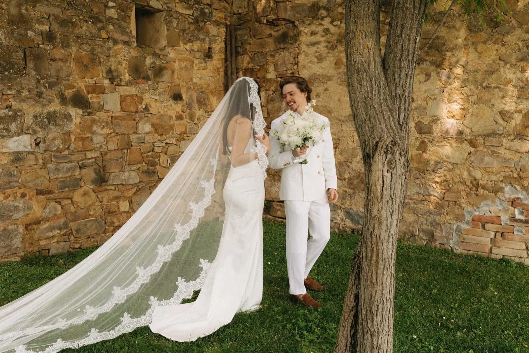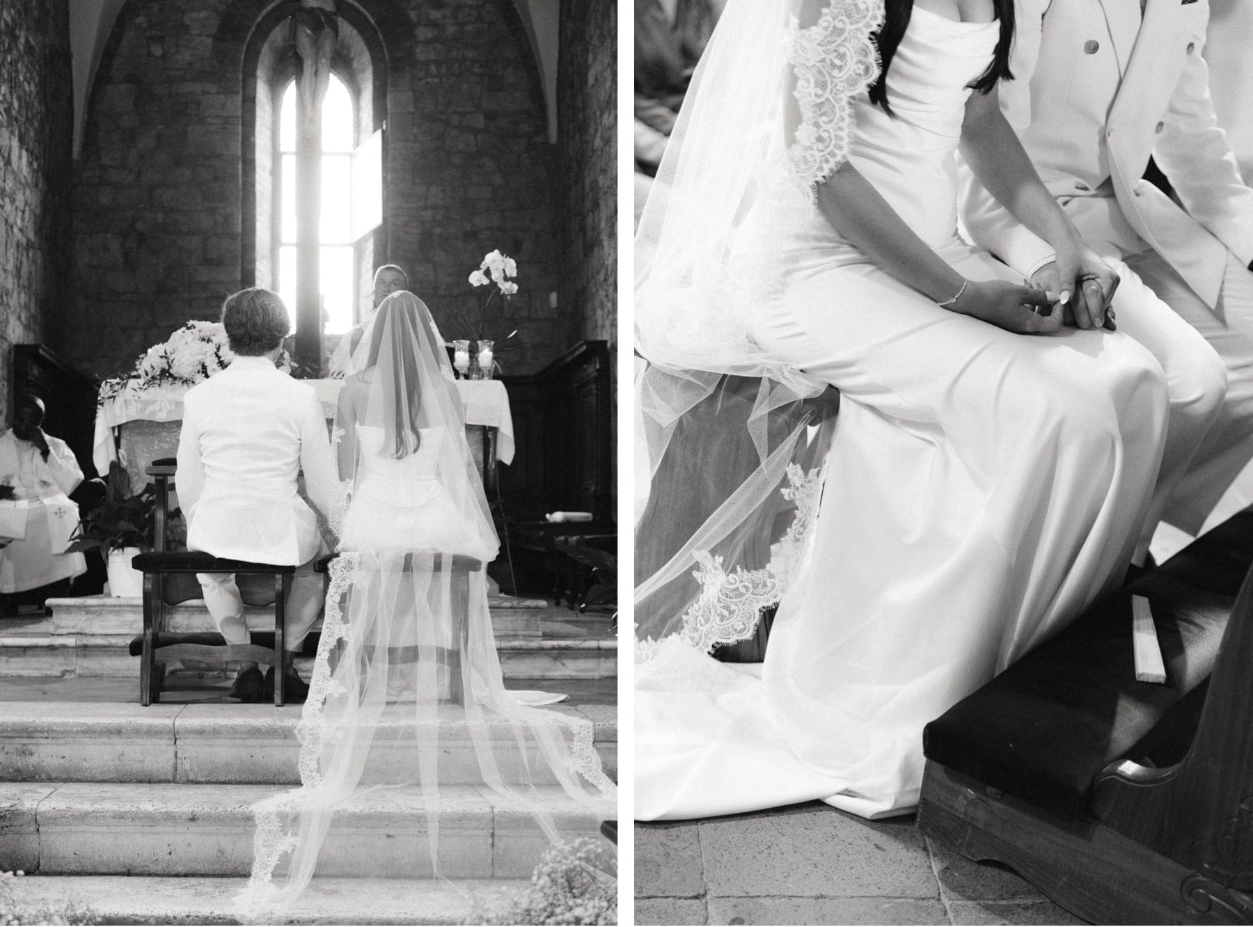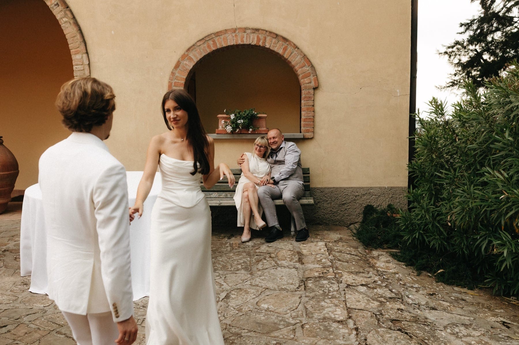 Ceremonia ślubna odbyła się w pobliskim, kameralnym kościółku, co jest bardzo częstym wyborem przy organizacji ślubu we Włoszech. To połączenie tradycji z późniejszym, swobodnym weselem w Toskanii daje idealny balans. Wnętrze kościoła, kameralność, naturalne światło i bliskość najważniejszych osób stworzyły niezwykle intymną atmosferę. Ślub we Włoszech często wyróżnia się właśnie tym – prostotą, autentycznością i ogromnym ładunkiem emocjonalnym.