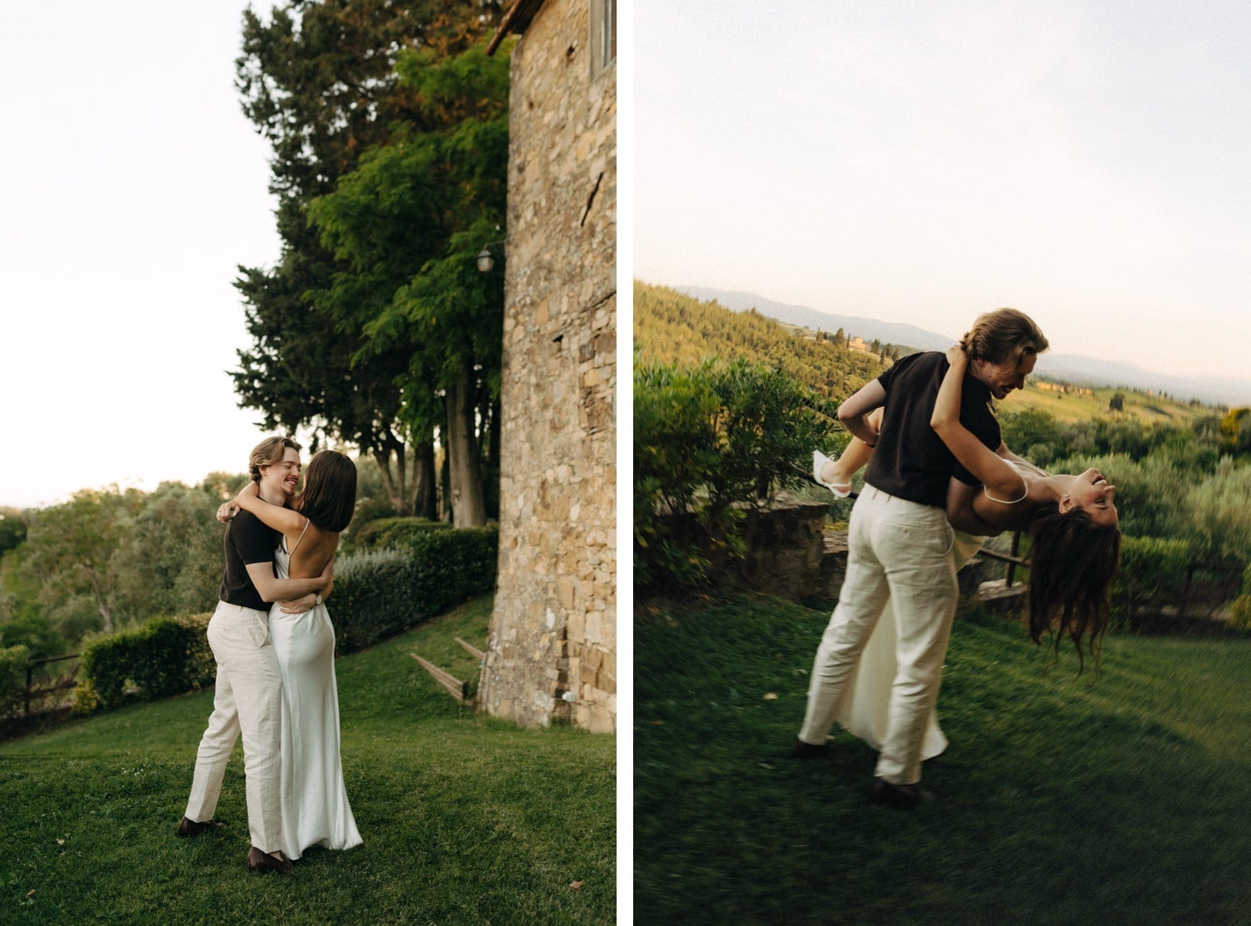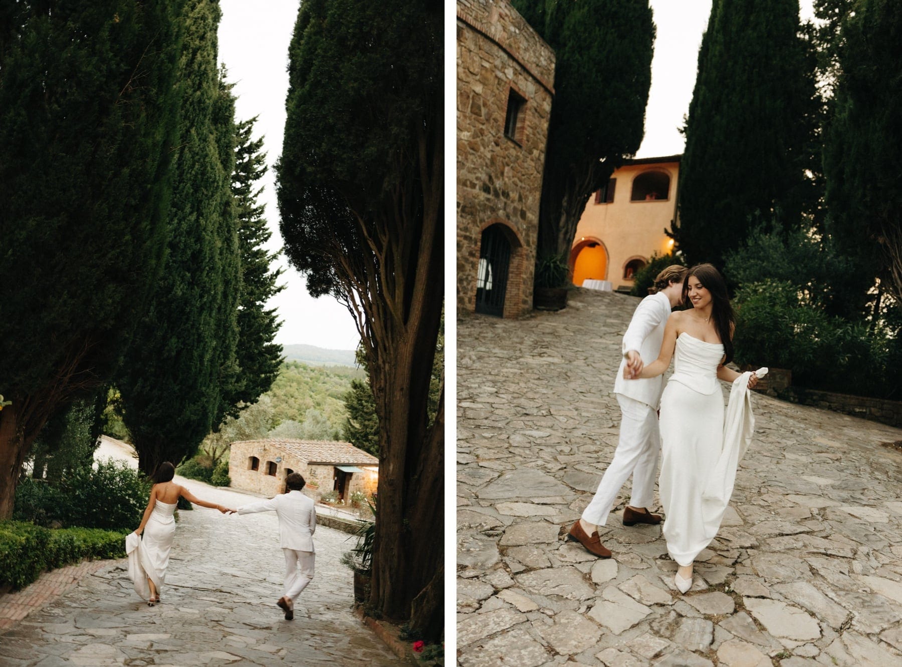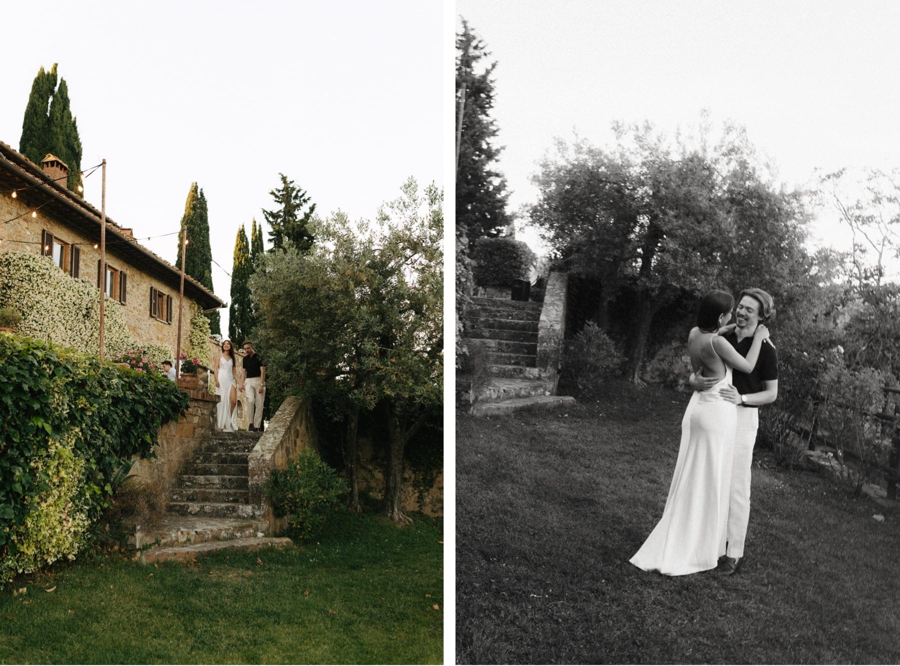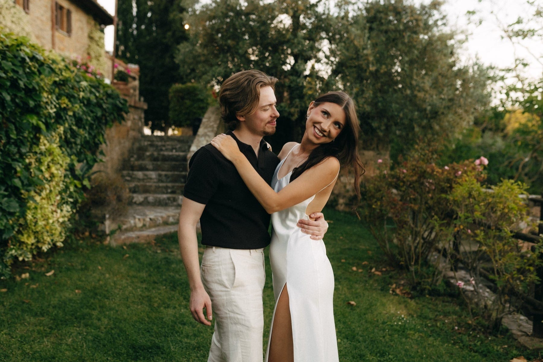 Sesja ślubna w Toskanii podczas dnia ślubu to jedno z najlepszych rozwiązań dla par, które chcą mieć piękne zdjęcia bez organizowania osobnego wyjazdu. W takich miejscach jak Quercia al Poggio jest pełno pięknej przestrzeni do wykorzystania, wzgórza Chianti, cyprysy i kamienna architektura. Tym razem wykorzystaliśmy krótki moment przejazdu z kościoła do agroturystyki na krótką sesję, a drugą część wykonaliśmy już po zachodzie słońca. Sesja ślubna w Toskanii to przede wszystkim światło, atmosfera i autentyczność – dokładnie to, co sprawia, że ślub we Włoszech jest tak wyjątkowy.